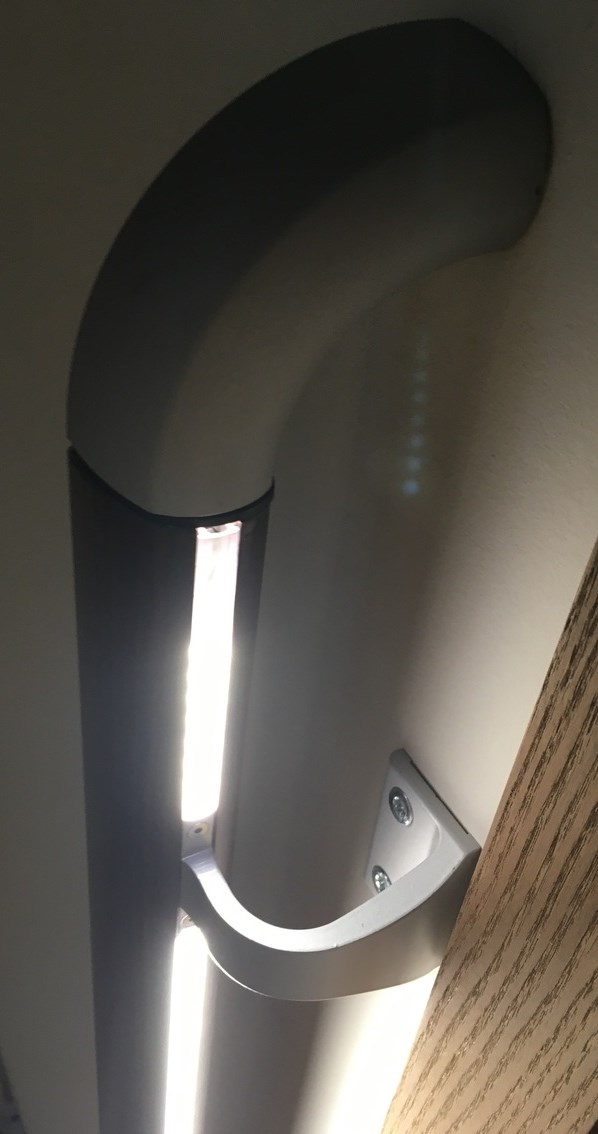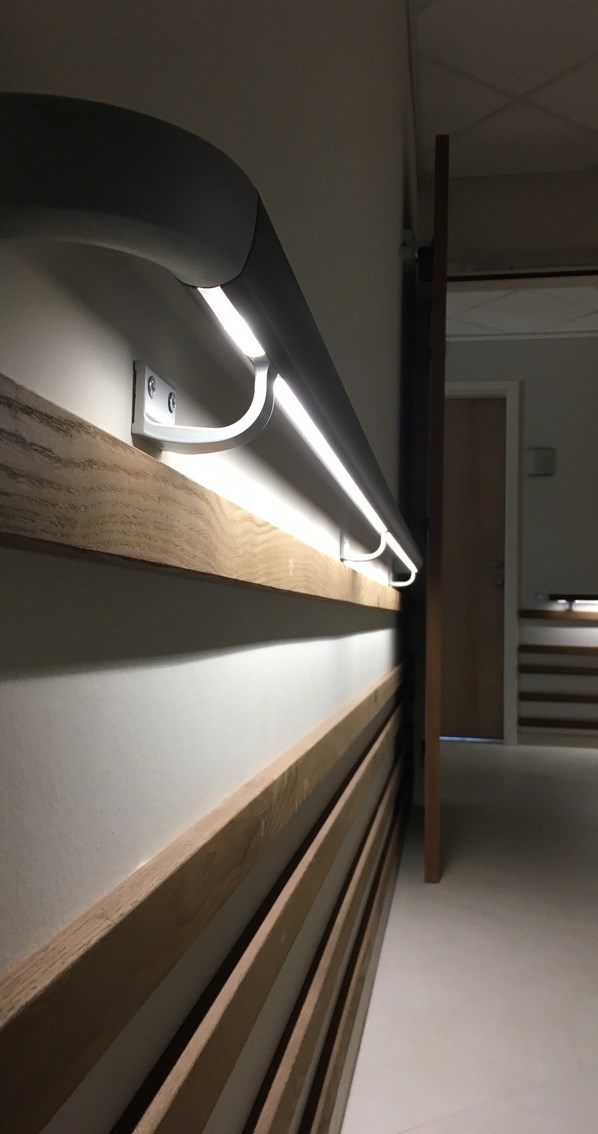 Om de bewoners zich in alle comfort en veiligheid te laten verplaatsen doorheen het gebouw, zijn in alle gangen handrails geplaatst. Voor de gangen van het zorghotel - waar ook ’s nachts bewoners en verplegers aanwezig zijn - viel de keuze op de handrails met ingebouwde ledverlichting van de firma Gerflor, specialist in innovatieve en decoratieve PVC- en wandoplossingen. “De driekantige vorm van deze handrails van Gerflor zorgt voor een uitstekende grip”, vertelt Roland Decorte AARD-architects.