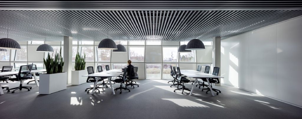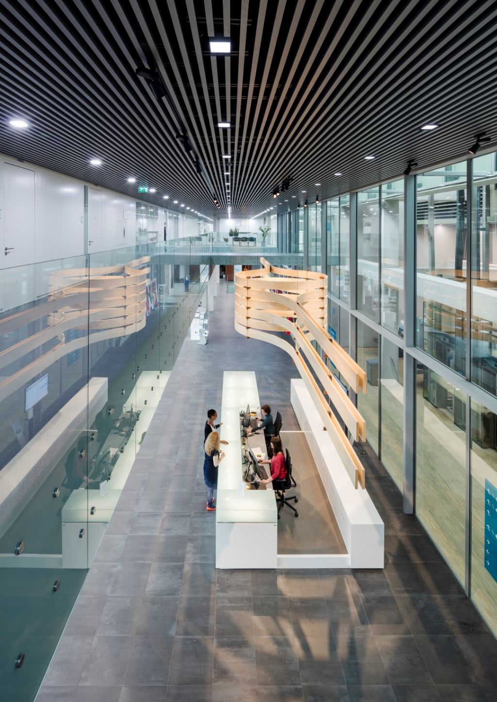 Naast het esthetische aspect had Hammer ook een praktische motivatie voor het lamellenplafond. Hammer: "Het is een open plafond en dat geeft je als architect extra ruimte om mee te werken. Zo kun je de meters tussen het plafond en plenum bijvoorbeeld meetellen in de berekeningen voor luchtkwaliteit. En in dezelfde ruimte kunnen ook nog eens installaties voor luchtkwaliteit en brandveiligheid fraai worden weggewerkt."