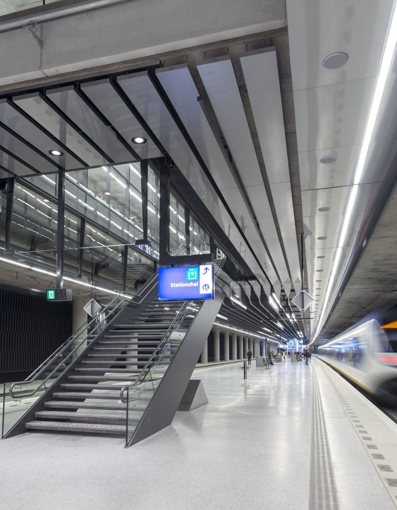 Het plafond omvat verschillende onderdelen met elk een eigen set aan eisen en oplossingen. Met het lawaai van de treinen en honderden reizigers die het station dagelijks passeren, is een optimale geluidsdemping essentieel.