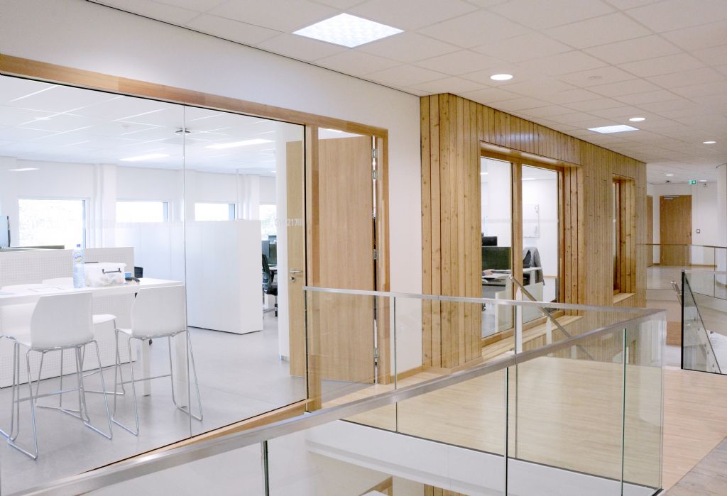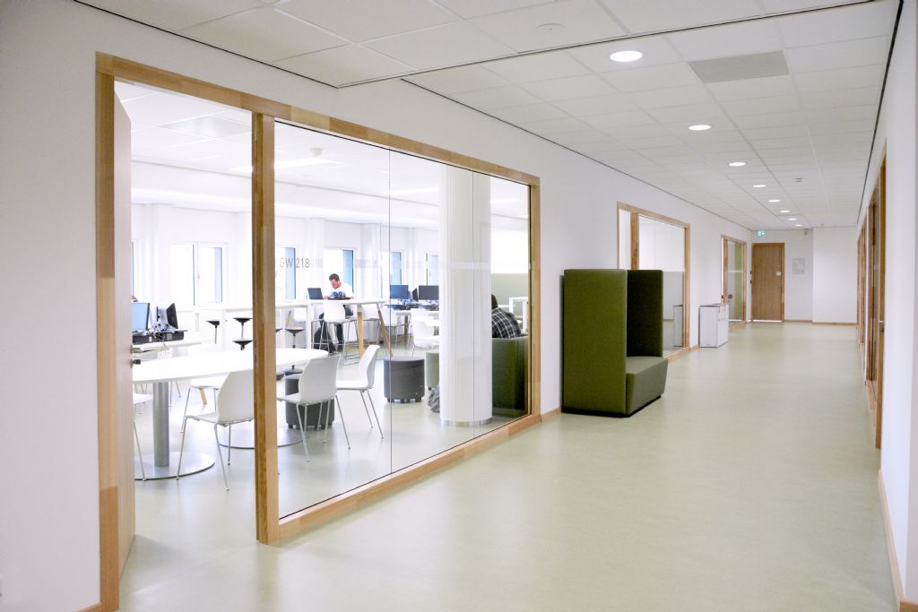 In aansluiting op het exterieur, blijft ook de binnenzijde van de laatste uitbreiding zoveel mogelijk gehandhaafd. De gangen hiervan bestaan uit een karakteristieke natuursteen, die ook verderop in het gebouw toegepast zijn. Deze worden behouden en plaatselijk uitgebreid. De uitstraling van het interieur is rustig en natuurlijk gehouden en sluit daarmee wat betreft kleur aan op het exterieur: de basis wordt gevormd door wit geschilderde wanden. Tussen de gangen en leerruimten zijn grote houten ramen toegepast, die door hun kleur een warme sfeer aan de ruimte toevoegen. Tegelijk dragen deze bij aan de transparantie binnen het gebouw en de organisatie. Dat vormde ook het uitgangspunt voor de lay-out: de docenten- en onderzoekersruimten zijn op een centrale plaats rondom een vide gegroepeerd, waardoor zowel het onderlinge contact als dat met de studenten bevorderd wordt.