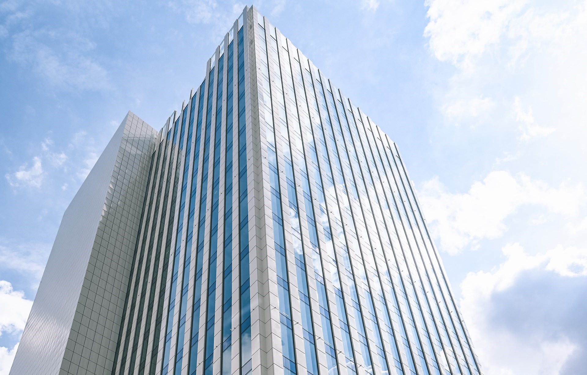De vernieuwde gevel, die uit een ritmische mix van beglaasde en witte metalen stroken bestaat, accentueert de slanke verticaliteit van de toren. De realisatie ervan had de nodige voeten in de aarde, geeft Sarai Bervoets aan. “De projectontwikkelaars kozen voor een niet-structureel cassettegevelsysteem dat we verdieping per verdieping moesten stapelen, terwijl de exacte aanpak voor de plint nog niet bepaald was. Om de voortgang van onze werken te garanderen, werkten we samen met de architect een aangepaste detaillering uit om de gevel toch al vanaf niveau +2 te kunnen opbouwen, zonder dat dit nadien visueel zichtbaar zou zijn. Uiteindelijk is de plint bekleed met natuursteen en hebben we een prachtig resultaat neergezet.”