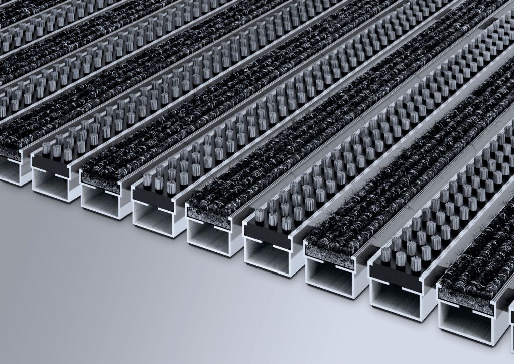 Voor de 12 inpandige entrees zijn de emco Diplomaat 517 TB geleverd. Deze zijn voorzien van slijtvaste textielborstelinlagen en zeer geschikt voor de opname van fijn vuil.