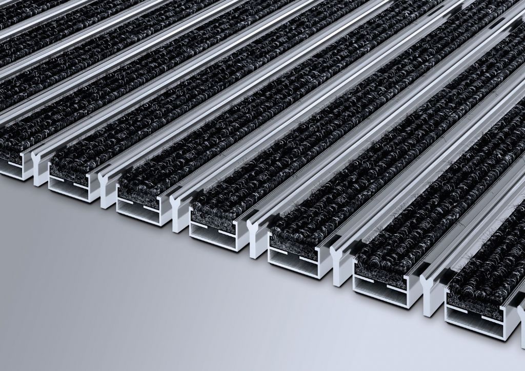 De mooie tapijtstrookinlagen en het opvallende schraapprofiel van aluminium, geven de entreemat bovendien een chique uitstraling.