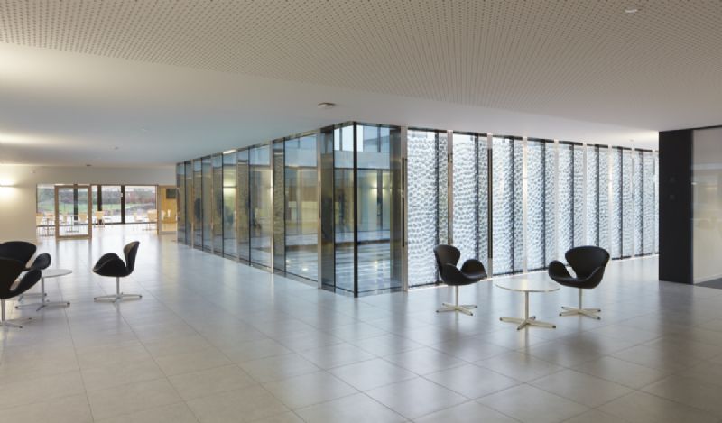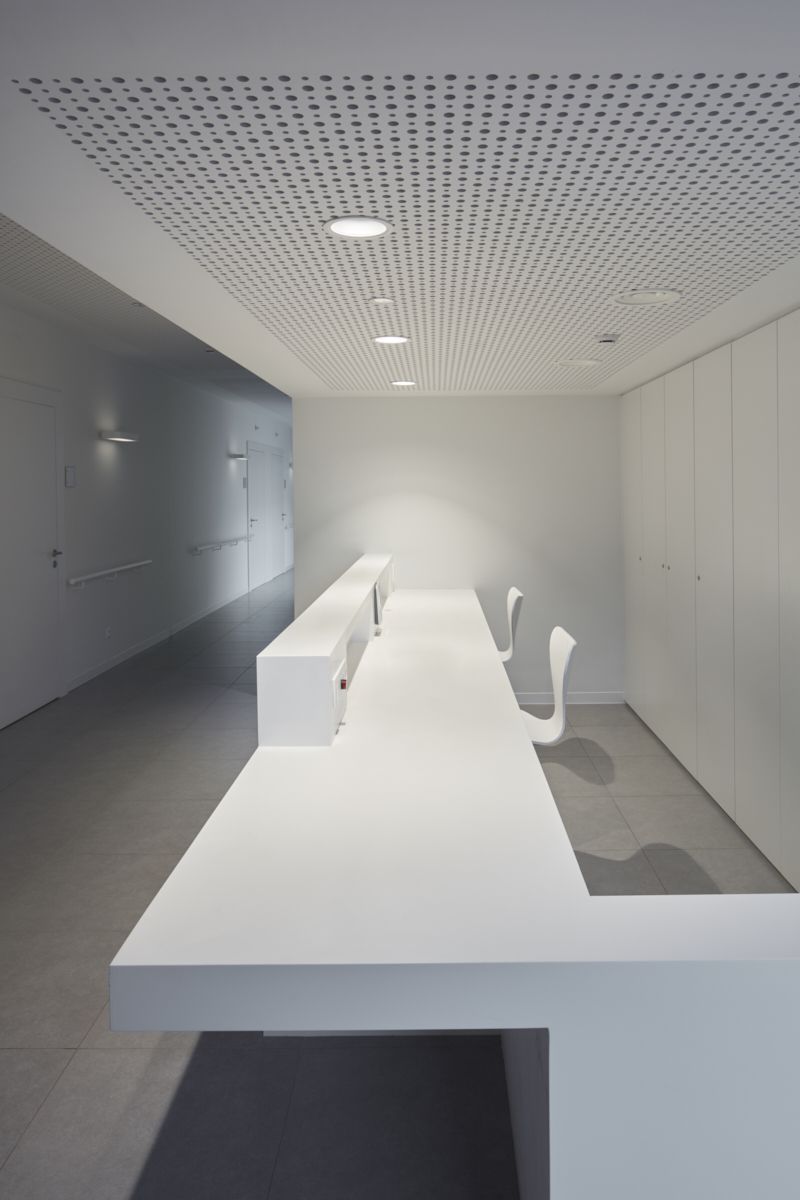 Er werd uiteindelijke gekozen voor Serie7 voor de verpleegposten en de restaurants. Deze passen zeer mooi op de bamboe vloer. Doordat de poten ongeveer dezelfde kleur hebben lijken de tafelbladen te zweven. Een aangepaste RO met voetbankje in blauw- en bruintinten staat in de hal en de gemeenschappelijke delen. Verder zijn er nog verschillende tafels en koffietafels geplaatst. Aan de receptie vinden we Oxfords en op het plein staan Swans.