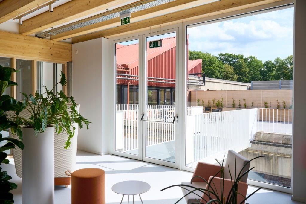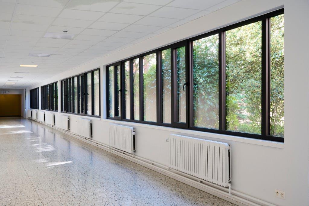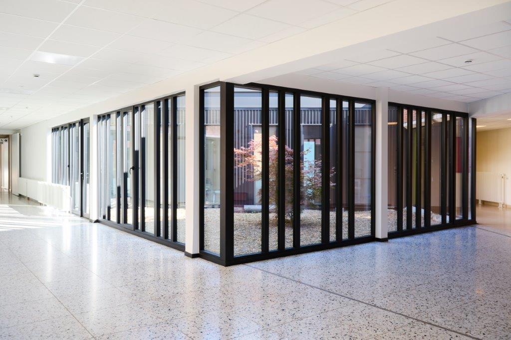 Het hele project steunt op vier pijlers: bereikbaarheid, groen, licht en toegankelijkheid. “De architect koos net alleen voor grote raampartijen om de natuur naar binnen te trekken, maar ook veel licht, wat zorgt voor een groot ruimtegevoel en een fijn welbevinden in het gebouw”, vertelt Jourik Duwez, salesmanager BeLux bij Aliplast.”