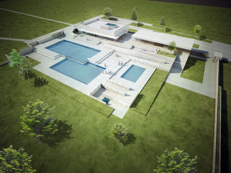 Het ontwerp van het openluchtzwembad is gebaseerd op het idee van stromend water en verwijst daarmee naar het water van de Pliniusbron. Het zwembad is vergelijkbaar met Romeinse badhuizen of met voorbeelden uit de natuur zoals Pamukkale in Turkije en refereert naar de oude badcultuur. De ruime ligweide vormt een groene oase die een prachtig uitzicht biedt op het park, de basiliek en het kasteel Betho. Het nieuwe paviljoen wordt zowel door vorm als door gebruikte bouwmaterialen geïntegreerd in het landschap.