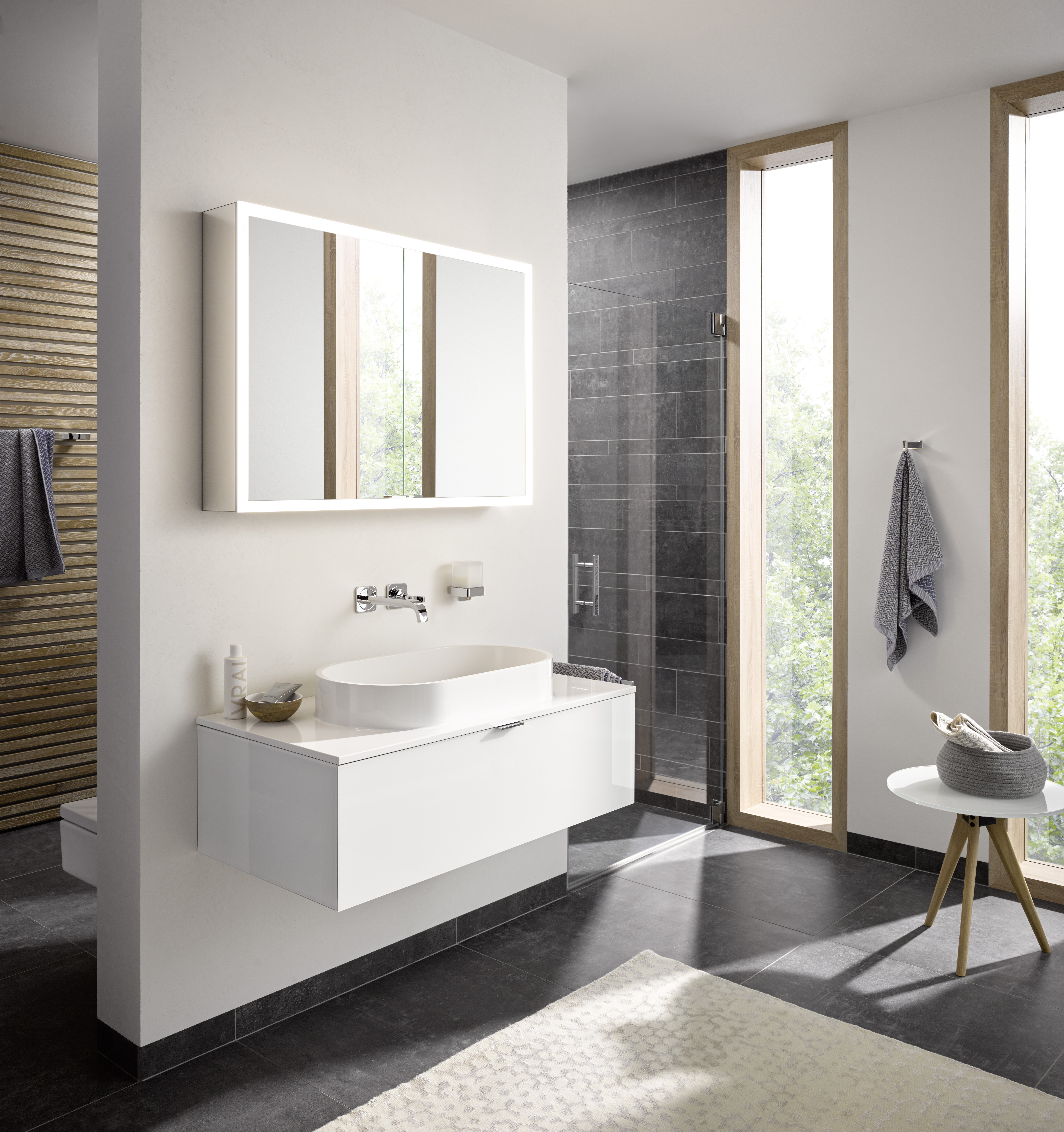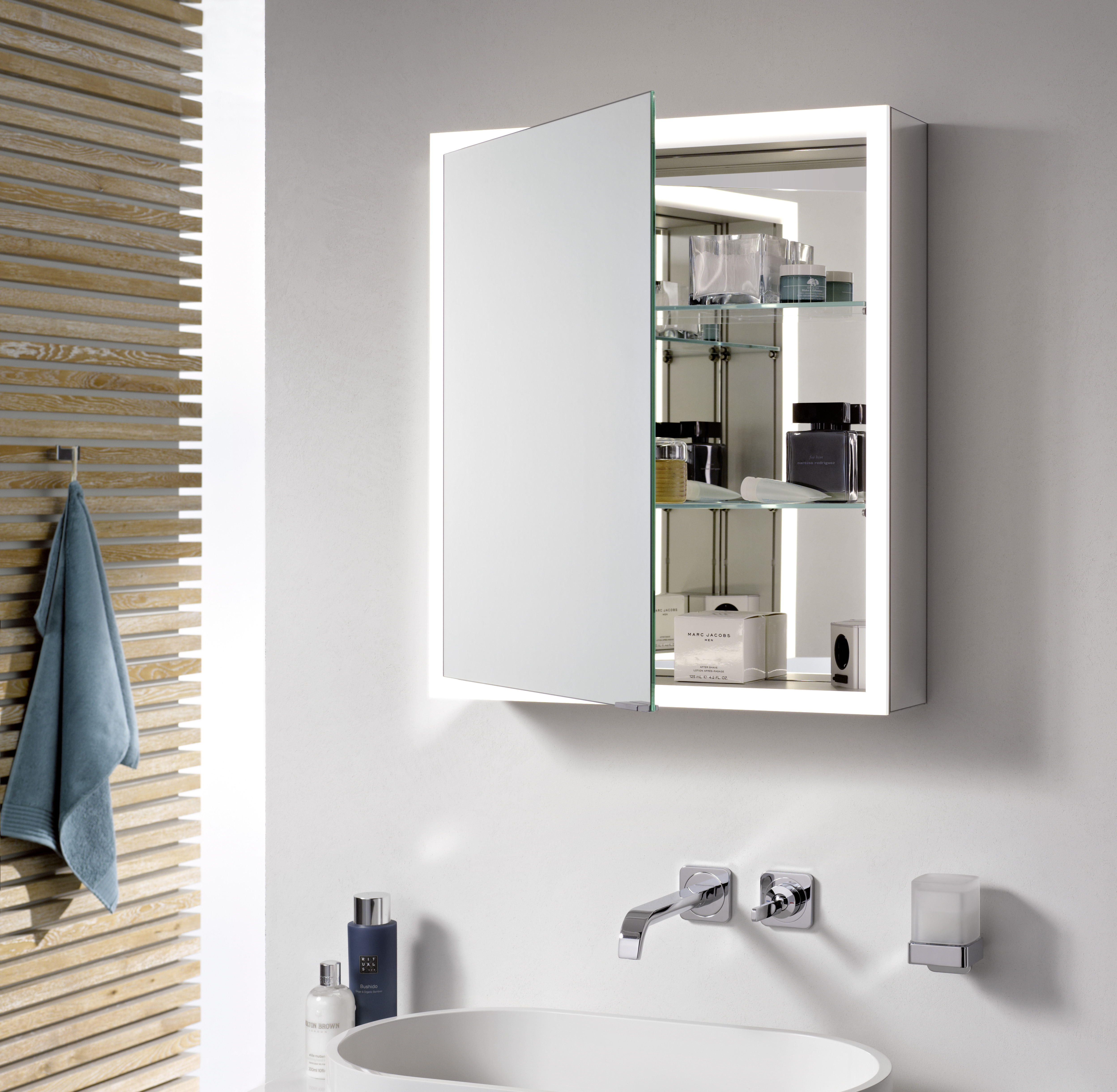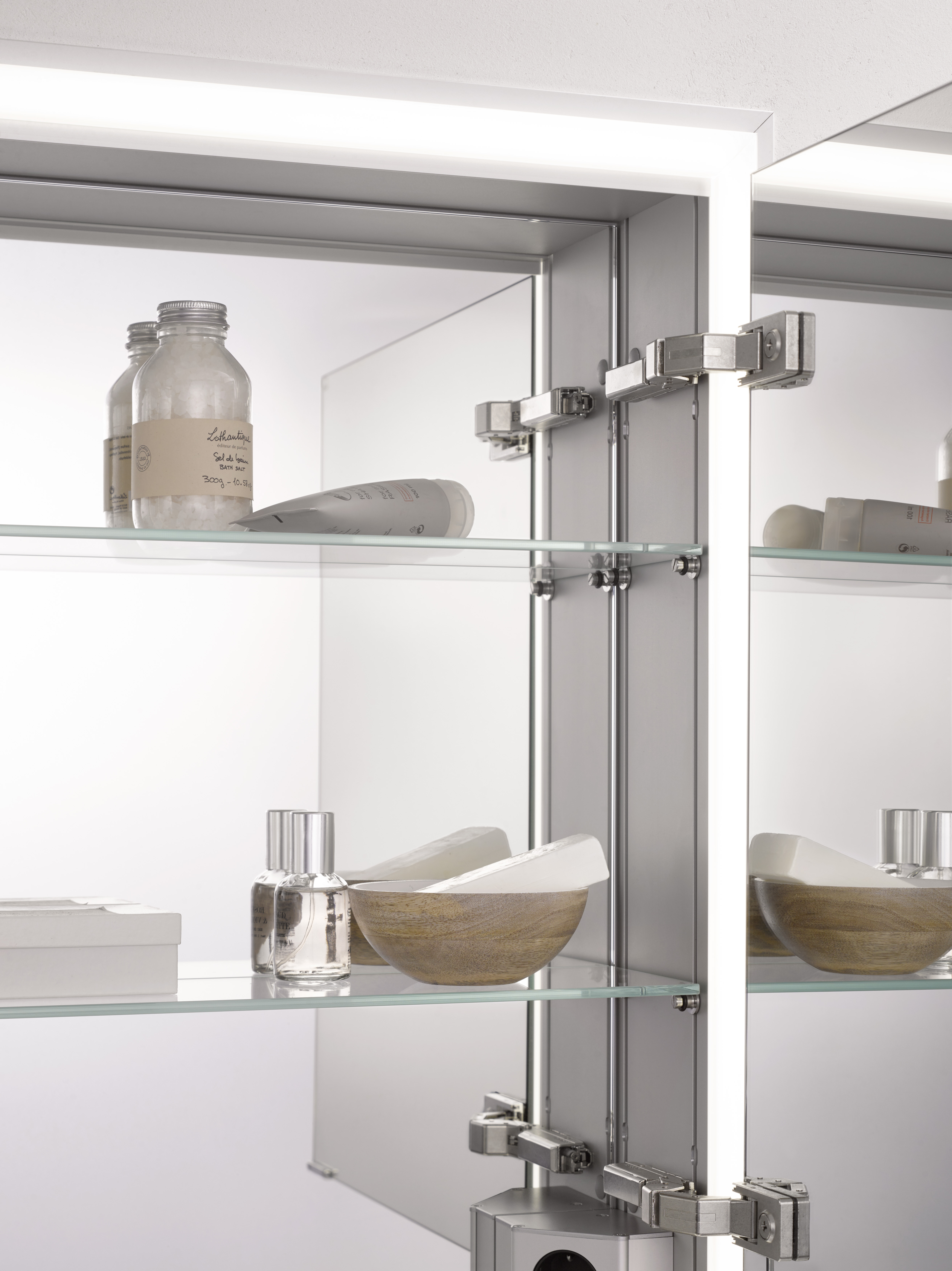 Verlicht met een rondom verlopende led-lichtband straalt het design van prime in volle glans. Met twee variabel instelbare glazen legborden kan elk accessoire plaatsbesparend worden opgeborgen. Als inbouwvariant biedt de lichtspiegelkast extra ruimtevoordeel.