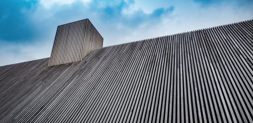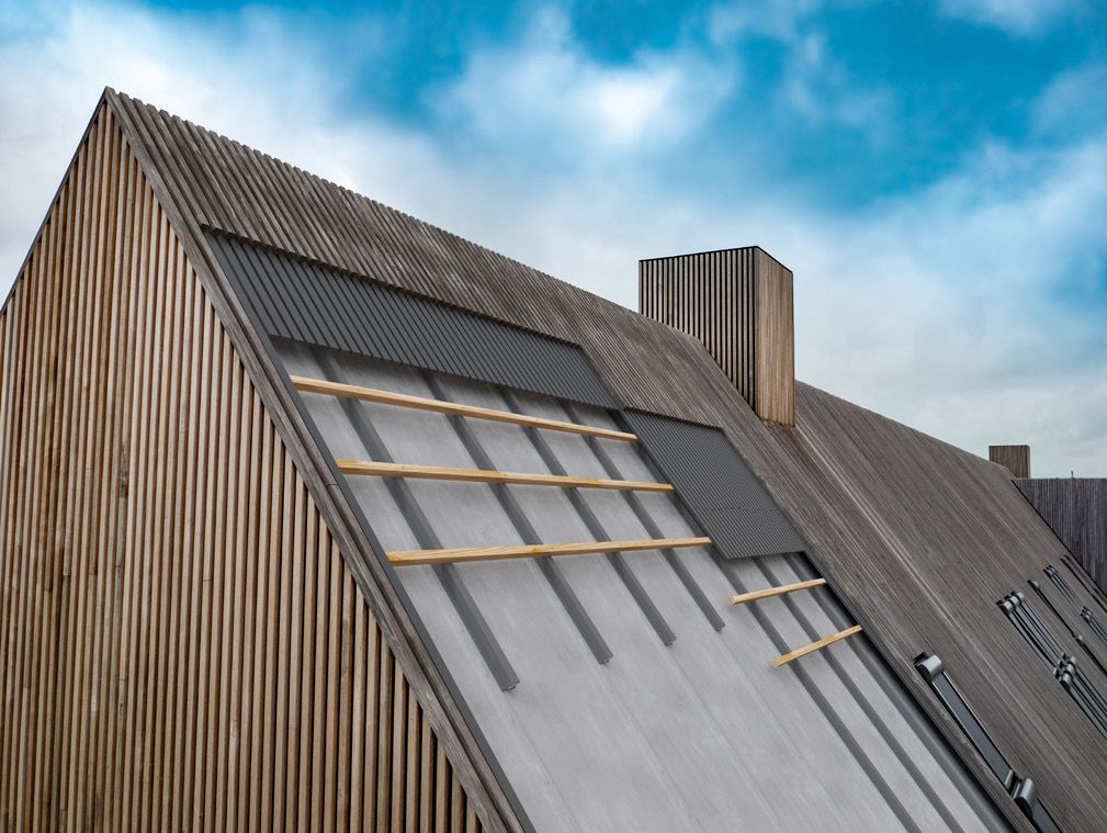 Het hout van de dakafwerking loopt mooi door op de gevel, daar zijn de latten wel op de traditionele manier bevestigd. Opvallend is de perfect aansluitende overgang tussen dak en gevel. Alles werd immers in het werk gesteld om de strakke lijnen van het gebouw niet te doorbreken.