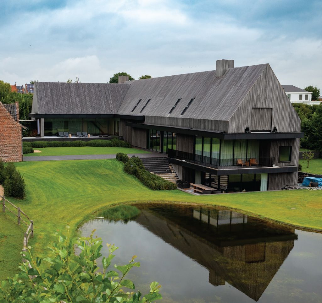 Op een idyllisch landgoed in de nu vredige Flanders Fields rond Ieper werd naast het bestaande gebouw een nieuwe woning opgetrokken. Strak en modern met een onmiskenbaar landelijke toets. De bouwheer wou zowel de gevel als het dak van het L-vormige gebouw afgewerkt zien met een stijlvol lattenwerk uit een tropische houtsoort. Maar qua uitvoering bleek deze houten enveloppe een minder evidente keuze. Architect Dries Bonamie zag twee problemen: enerzijds, hoe dit zware hout bevestigen met het oog op een waterdicht dak, en anderzijds, wat met de afschuifkrachten?
