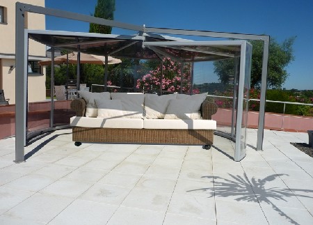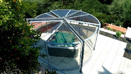 De panoramische overdekking, met een binnendiameter van 3,26 tot 6,60 men een hoogte van 2,20 m, bestaat uit een bovenstructuur in aluminium en 2, 3 of 6 draaiende elementen: het dak in alveolair polycarbonaat van 8 mm, glijdende elementen in ‘kristal’ polymetacrylaat (4 mm) en de bekleding met anti-uv-behandeling.