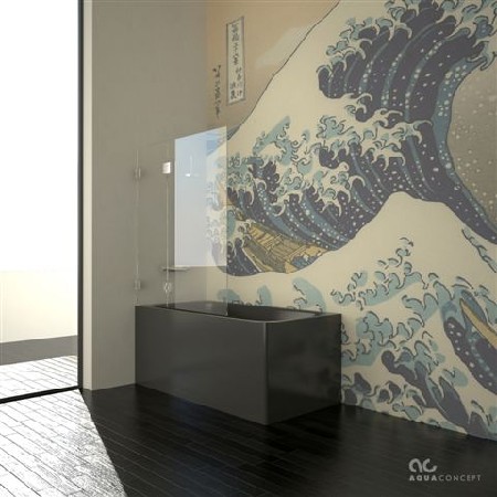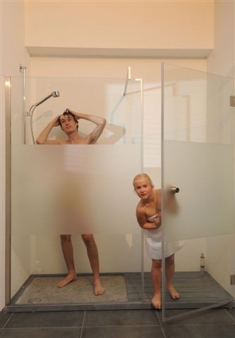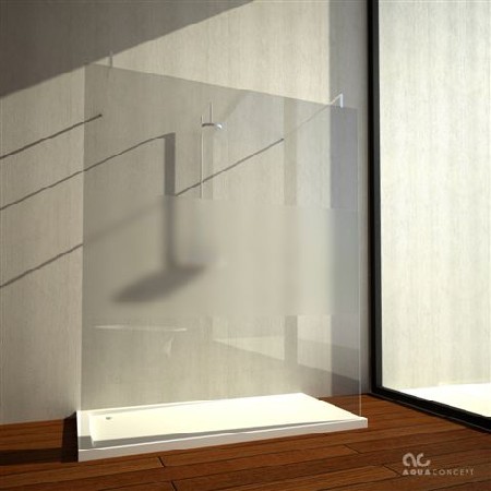 Voor de volle glaspartij van zijn inloopdouche heeft de klant de keuze tussen 20 glassoorten. De glaspartij kan daarbij neutraal helder glas zijn, maar ook plaatselijk gezandstraald zijn met een motief of een intieme zone verbergen. Voor opperste discretie kan zelfs gekozen worden voor gespiegeld glas. Voor de achterwand kan men in plaats van klassieke betegeling kiezen voor de ‘Aquawall’, veiligheidsglas van 8mm, op maat geslepen en gecoat in de kleur van je keuze. Hier kan men ook een foto of afbeelding laten printen.