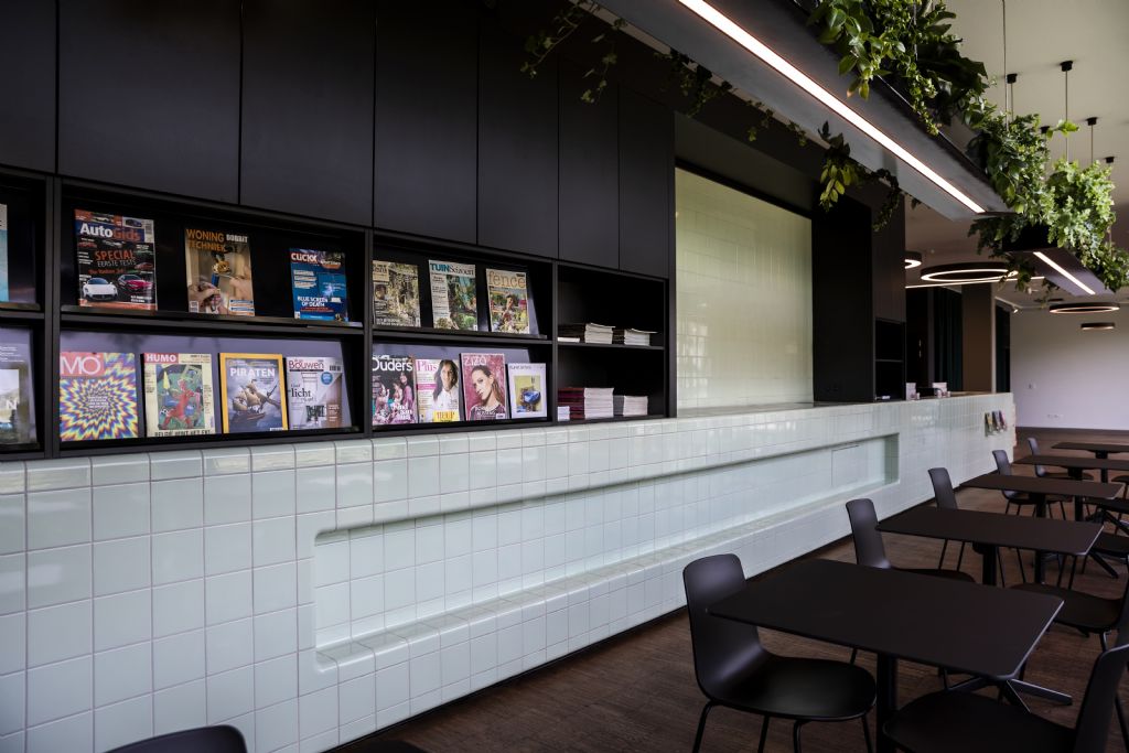 De bibliotheek van As is een echt trefpunt geworden. Het was een vereiste van de gemeente dat de toegang tot het gebouw laagdrempelig zou worden. Daarom kom je als eerste niet de boeken, maar wel een ontmoetingsruimte tegen. “De ruimte heet ‘De warme kamer’ en is gebaseerd op een dorpscafé. Een houten vloer, donker meubilair met tijdschriften en kranten, veel planten en een lange toog die fungeert als balie”, vertelt Dieter Van Loon, architect bij Architectuur Depot. De openingsuren van het gemeentehuis en de bibliotheekbalie vullen elkaar aan, zodat de bib ook toegankelijker wordt als informatiepunt.