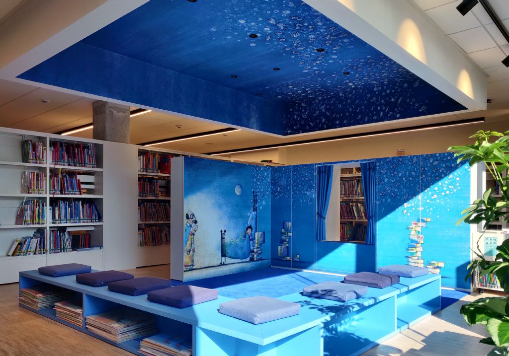 In Opglabbeek lag de nadruk op sociaal contact en het beleven van cultuur in de brede zin. Het resultaat is een belevingsruimte met het boek als decor. Anderzijds krijgen de kinderen hier vooral de aandacht. “Er is een voorleeshoek met een illustratie van Frank Daenen op de muren en plafond. Blauw is de accentkleur in de bib van Opglabbeek en groen in As. Dat komt ook terug in de retrostoeltjes die we opnieuw gestoffeerd hebben,” zegt Van Loon. “Verder hebben we voor elke leeftijd een andere zone gecreëerd. Van een gezellige zetel om de krant te lezen tot studeermeubel voor studenten.”