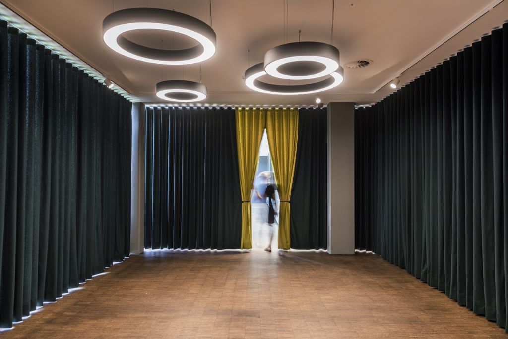 Een element dat onvermijdelijk is in een bibliotheek? Boeken. Architectuur Depot heeft er dankbaar gebruik van gemaakt voor de akoestiek. In de multifunctionele ruimte van de bibliotheek in Opglabbeek prijkt een blauw boekenplafond aan de hemel.