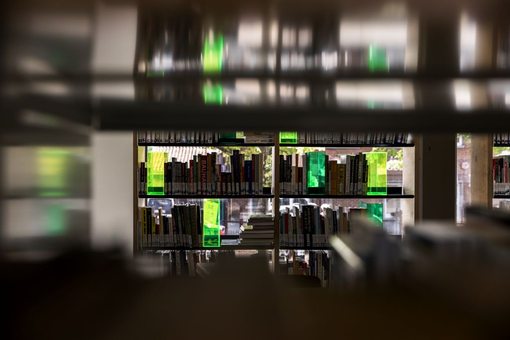 In As werden de boeken op een andere manier in de aandacht gebracht. “De buitenmuren zijn er voornamelijk ramen. Dat is niet eenvoudig, want we wilden de boekenrekken voor de ramen zetten. Esthetisch zou dat niet mooi zijn omdat de papierkant van de boeken dan naar buiten gericht staat. Anders kon de lezer de kaft niet zien,” aldus Van Loon. “Als oplossing hebben we plexiglazen boekensteunen in verschillende tinten gemaakt. Als de zon binnen schijnt geeft dit hetzelfde effect als bij glasramen en als het donker is en het waaklicht brandt binnen, schijnt het licht weer door de plexiglazen naar buiten.”