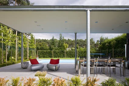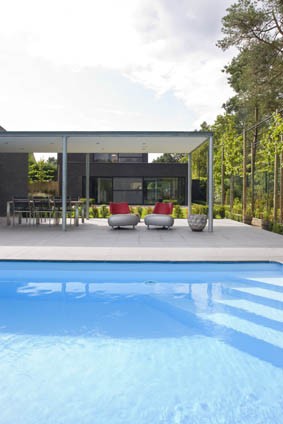 Less is More. Zo simpel kan een poolhouse zijn. In dit geval gaat het niet om een aparte constructie, maar werd het poolhouse geïntegreerd in het strakke assenstel van woning en tuin. Bekeken vanaf de rooilijn vinden we eerst het woonblok terug, vervolgens de graspartij die overloopt in een terras dat op zijn beurt overgaat in het zwembad. Het poolhouse laat zich perfect inkapselen in deze zonering. Het bestaat simpelweg uit vier ranke stalen palen bekleed met een slanke dankconstructie en afgewerkt met een wit plafond met ingebouwde verlichtingsarmaturen.