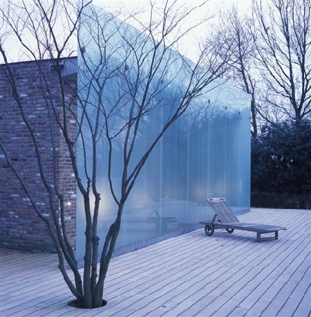 Dit poolhouse kadert in een algehele renovatie van een bestaande woning in Asse. Een prachtige locatie en dito tuin met uitzicht op de Brusselse skyline. Het huis kon een grondige opsmukoperatie wel gebruiken en ook de tuin werd aangepakt. Dankzij grote structurele raampartijen kunnen de bewoners nu optimaal genieten van het uitzicht op hun tuin en de wijde omgeving. Om de eenheid van deze ingrepen niet te verstoren, kreeg glas ook een hoofdrol toegemeten voor het poolhouse. Vandaar de keuze om het poolhouse af te schermen met een doorlopende glazen wand met een halfdoorzichtige beglazing, gecombineerd met indirecte verlichting. ’s Avonds creëren de schaduwen van de douchende kinderen of andere voorbijgangers een sfeervol lichtspektakel.