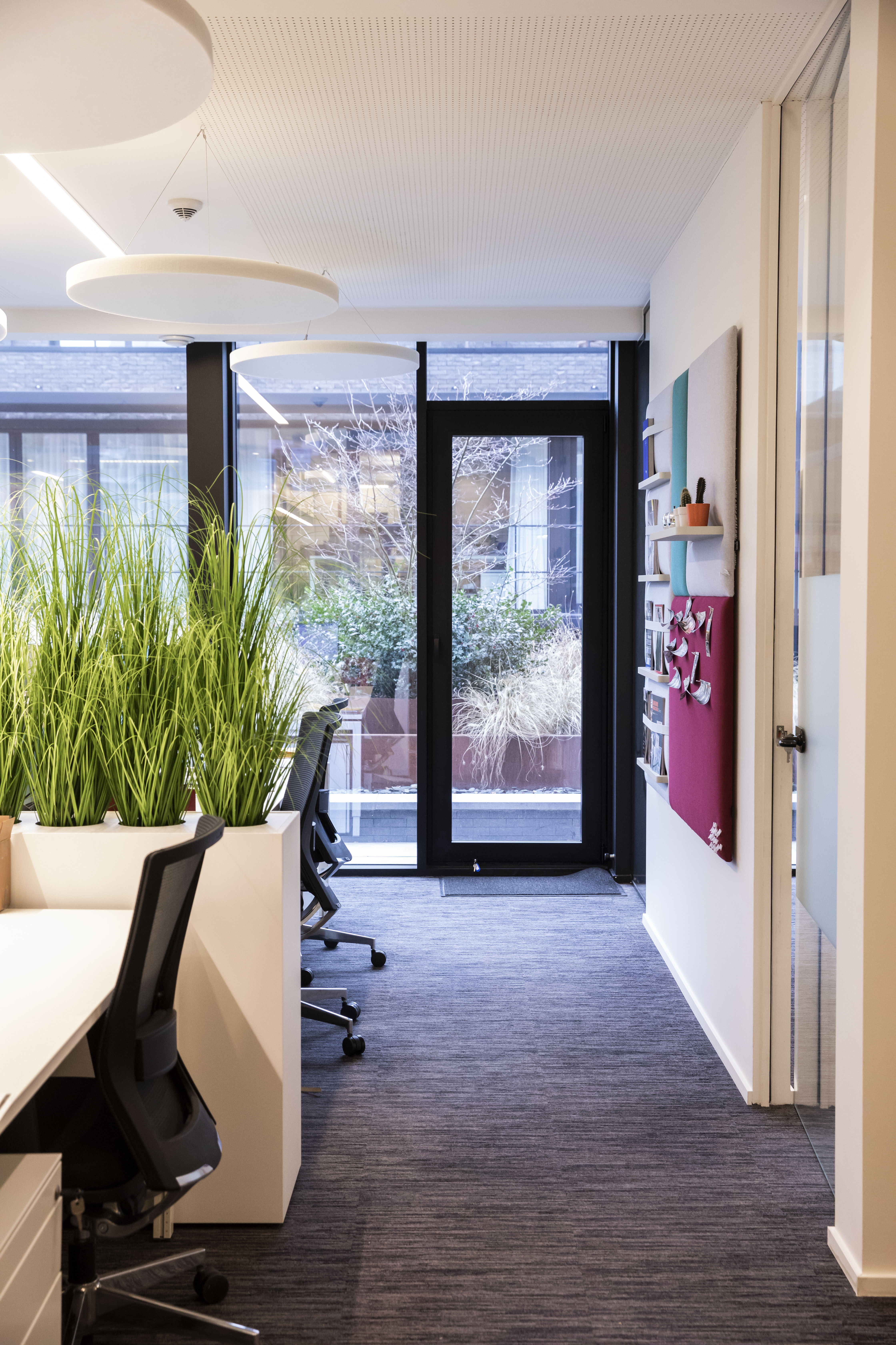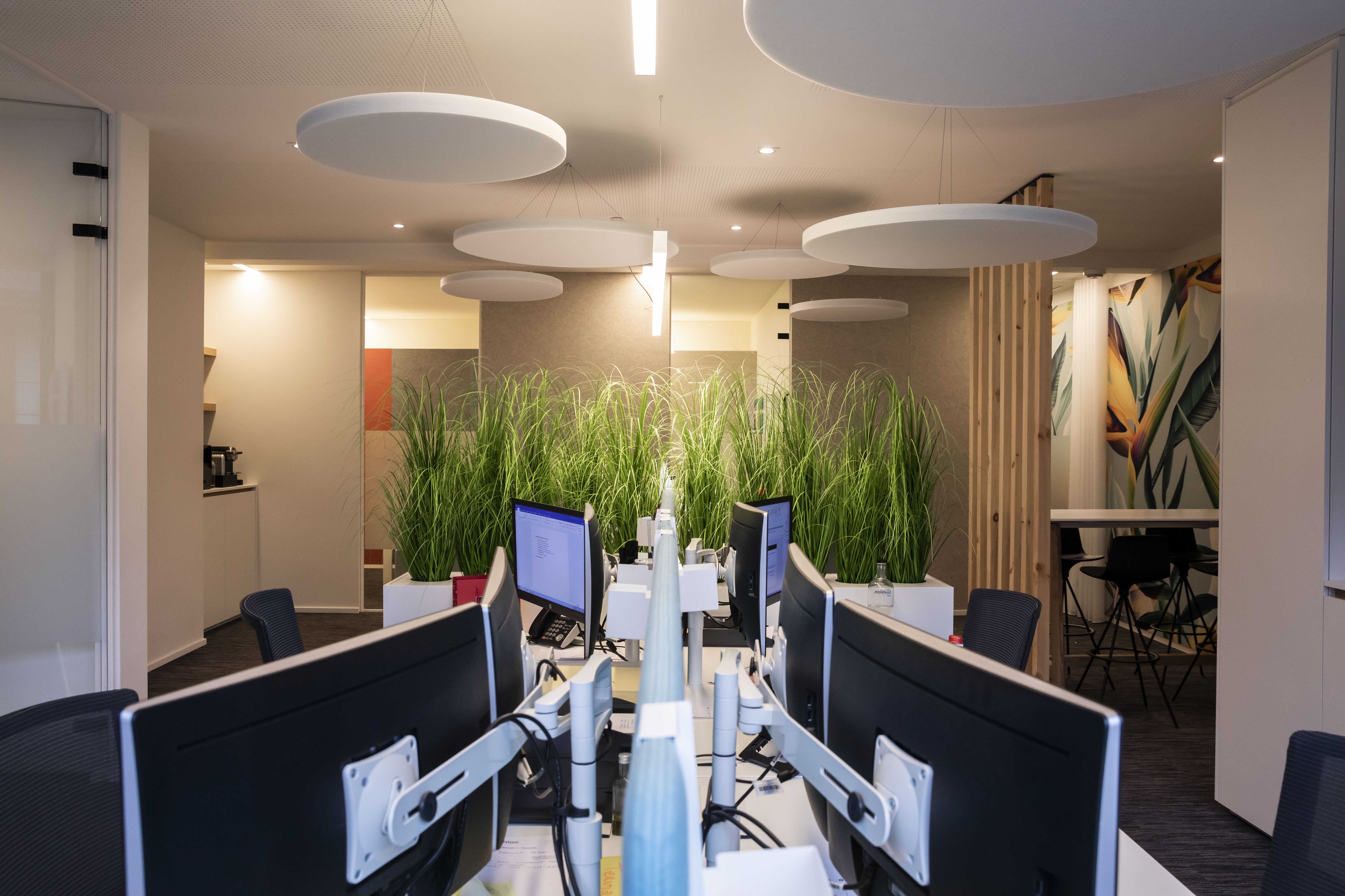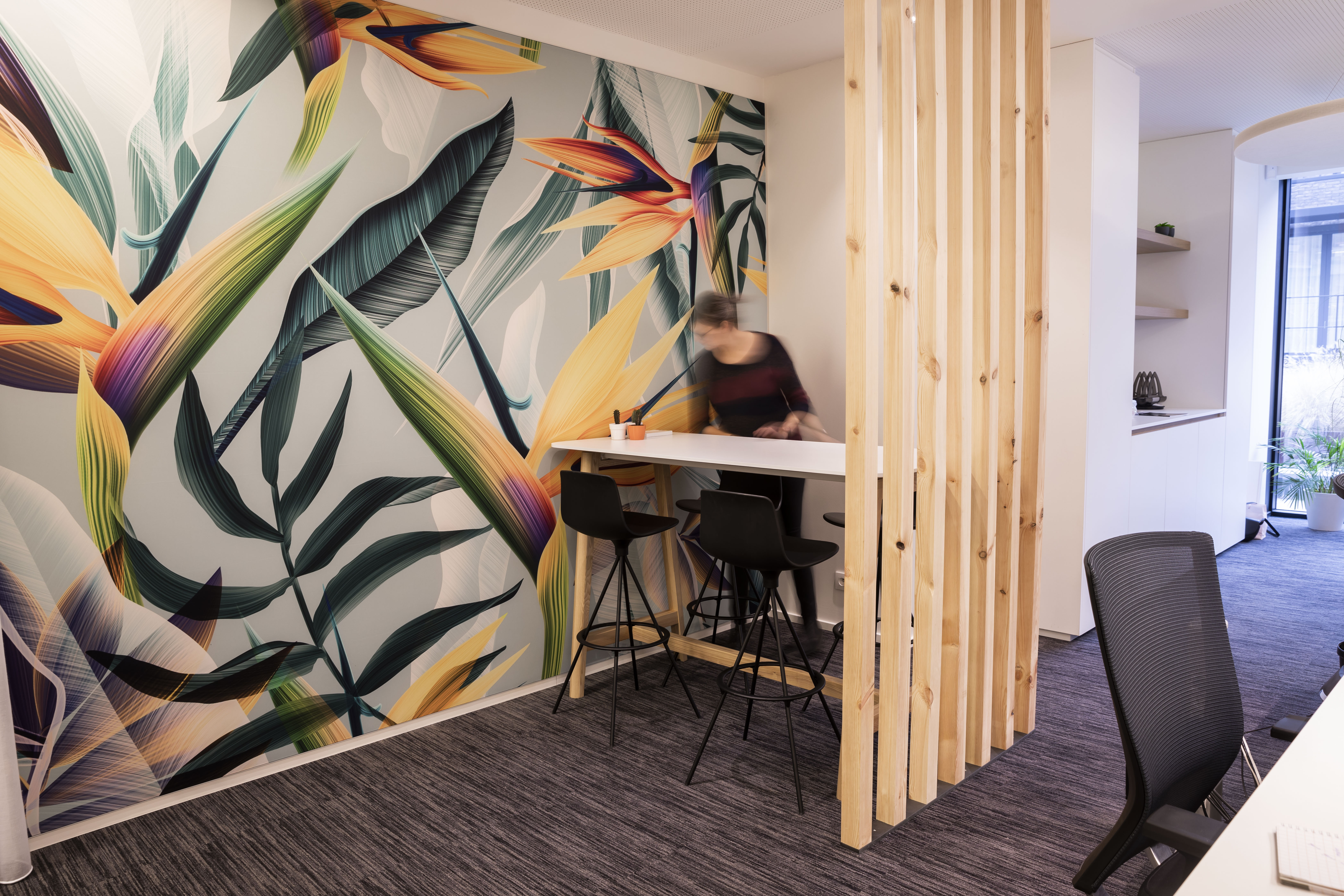 De werkplekken worden gescheiden door tussenwanden, met accessoires zoals plantjes. Die huiselijkheid trekt zich ook door in de plantenbakken met kunstgras, die het geheel extra gezellig maken. Eyecatcher in de ruimte is ongetwijfeld de akoestische visual. Hiervoor deed Belisia een beroep op de creativiteit van de werknemers. “Om de print te bepalen, hebben we een wedstrijd uitgeschreven waarin de werknemer met de meest geschikte visual won”, klinkt het.