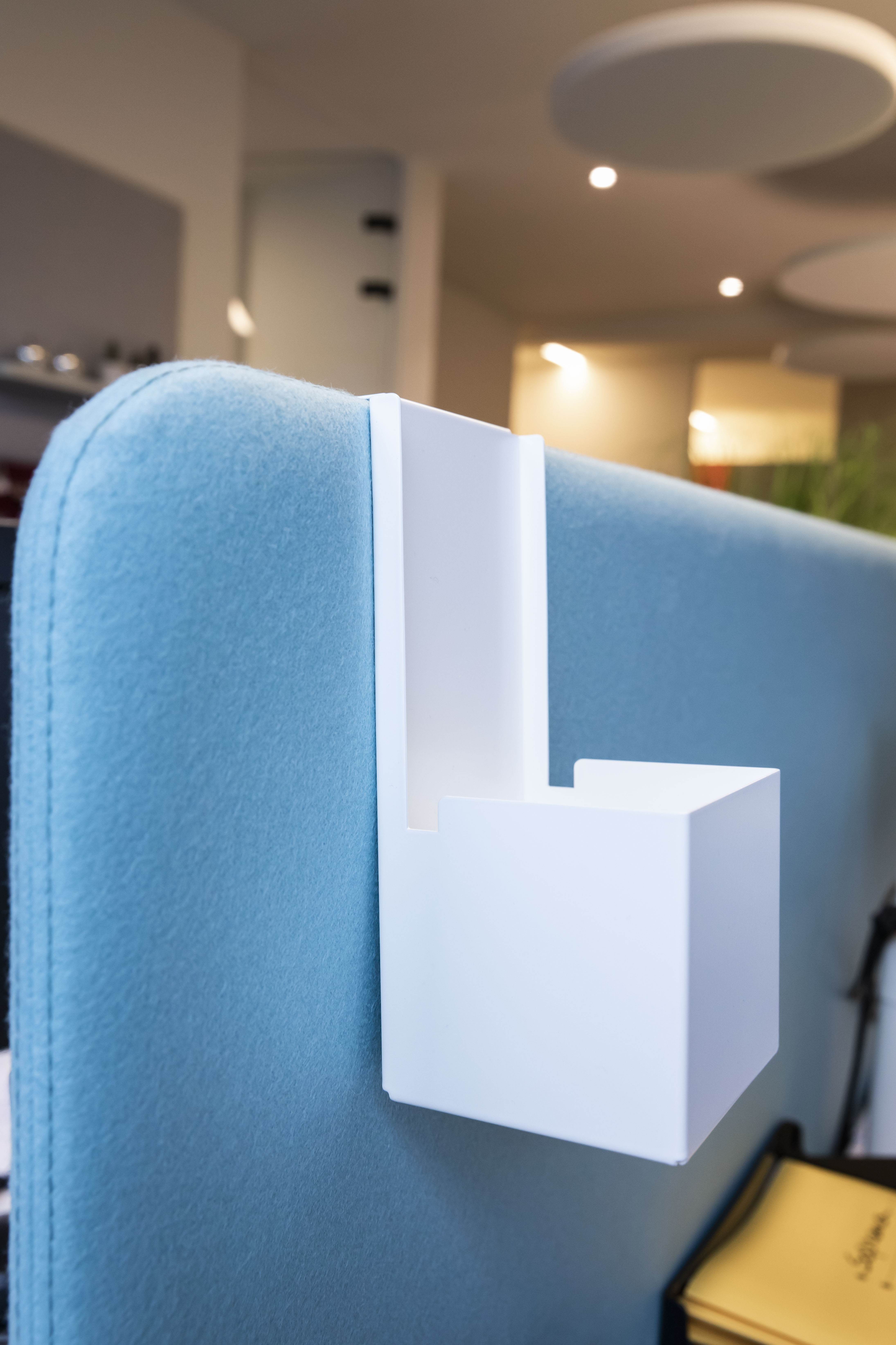 Door niet te kiezen voor pure akoestische oplossingen maar door het combineren van akoestiek met verschillende andere functies, kon Belisia akoestiek en esthetiek netjes verenigen. Zo werd in het akoestisch verhaal bijvoorbeeld ruim rekening gehouden met presentatie, verlichting en het gebruik van bureauaccessoires (pennenbakje, zie afbeelding onderaan). De akoestische elementen zijn zo geïntegreerd dat ze onderdeel uitmaken van het interieur en niet losstaan en gezien worden als noodzakelijke aanvullingen. Het thuisgevoel van de werknemers is zo opmerkelijk gestegen.