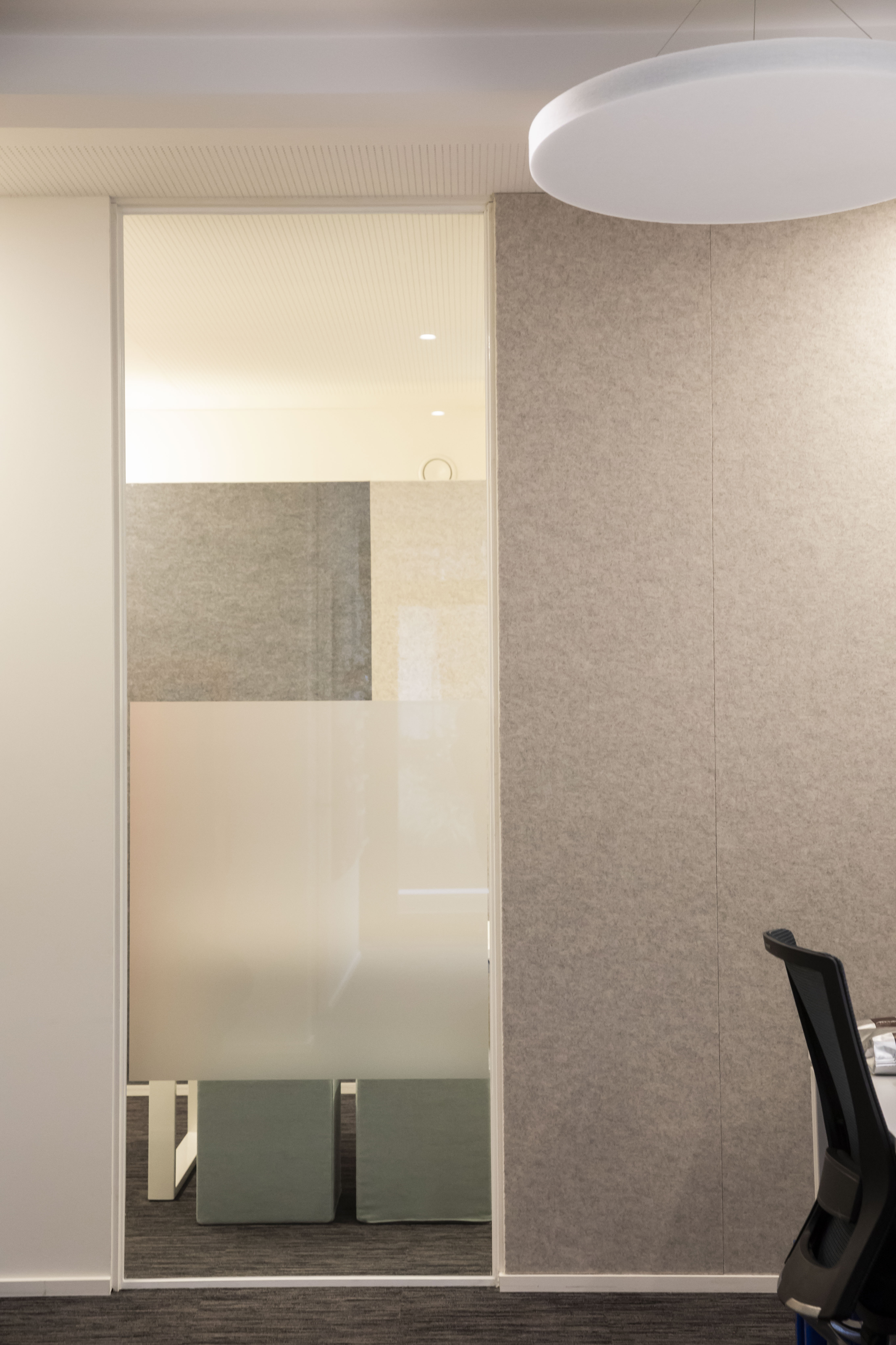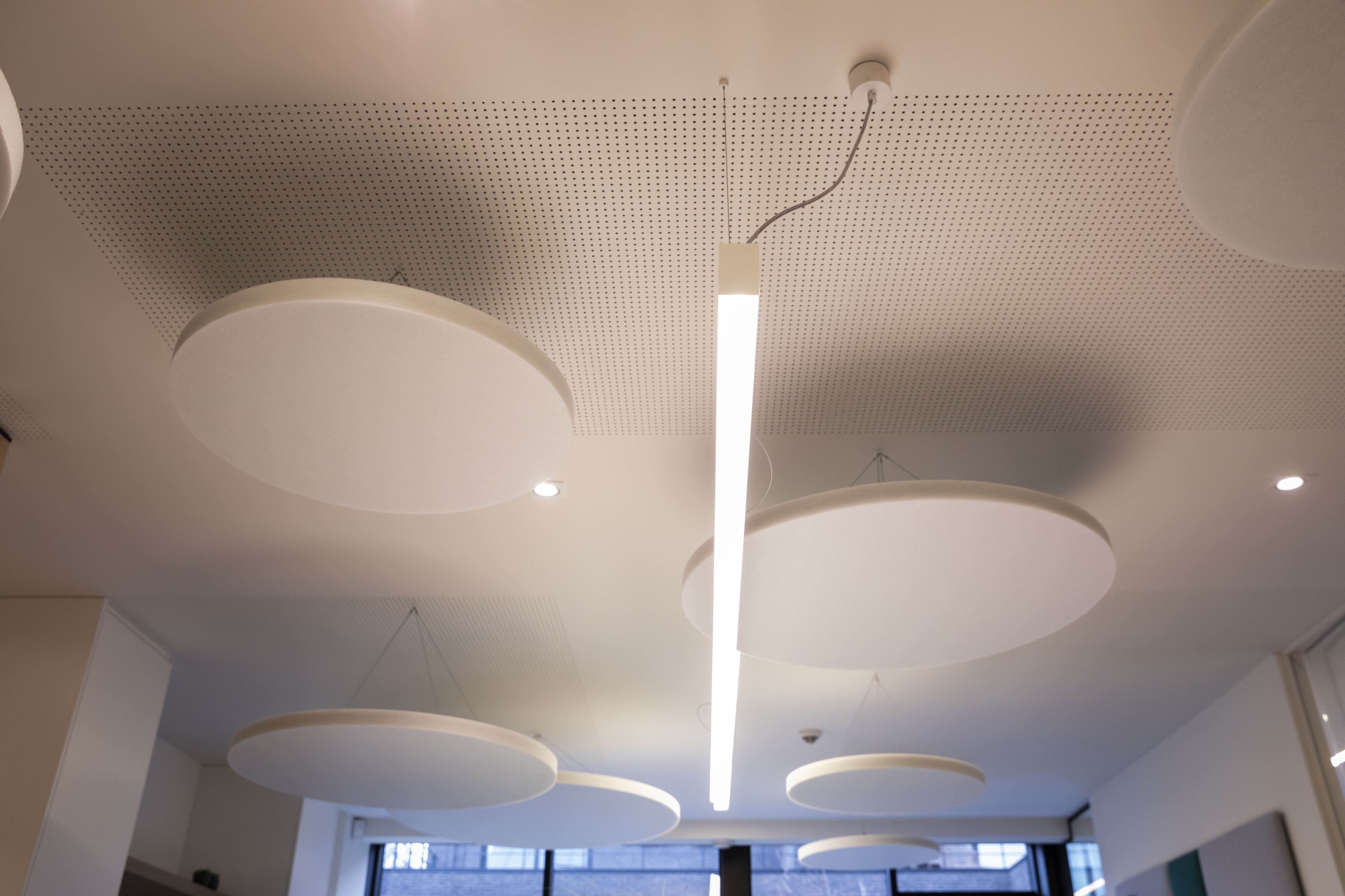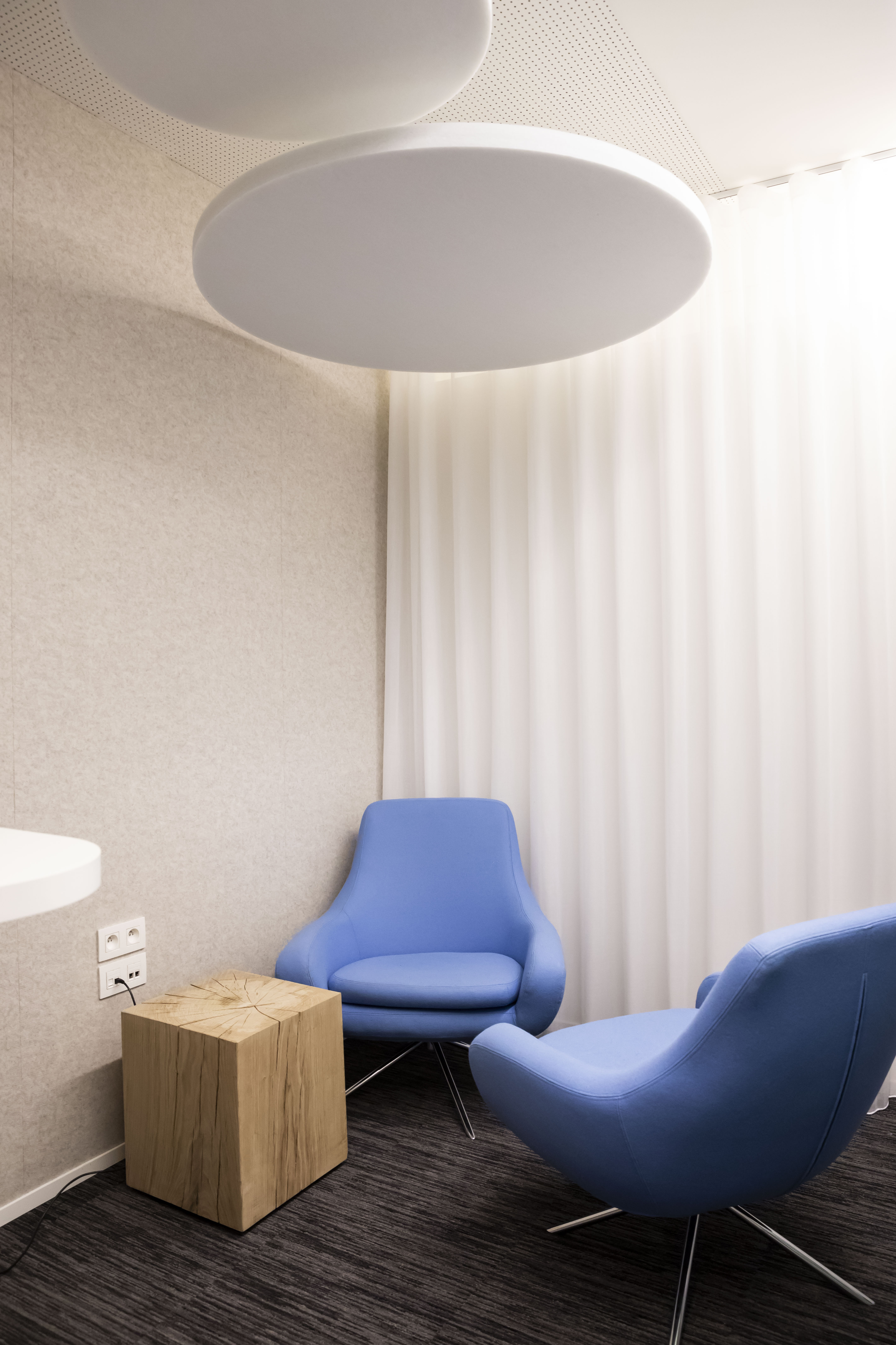 Ook op het vlak van duurzaamheid zette Belisia in dit project haar beste beentje voor. Het interieurbureau werkt uitsluitend met fabrikanten die de nodige duurzaamheidscertificaten kunnen voorleggen. Voorbeelden hiervan zijn de vilten bekleding en de akoestische plafondschuiven, die gemaakt zijn van gerecyclede petflessen.