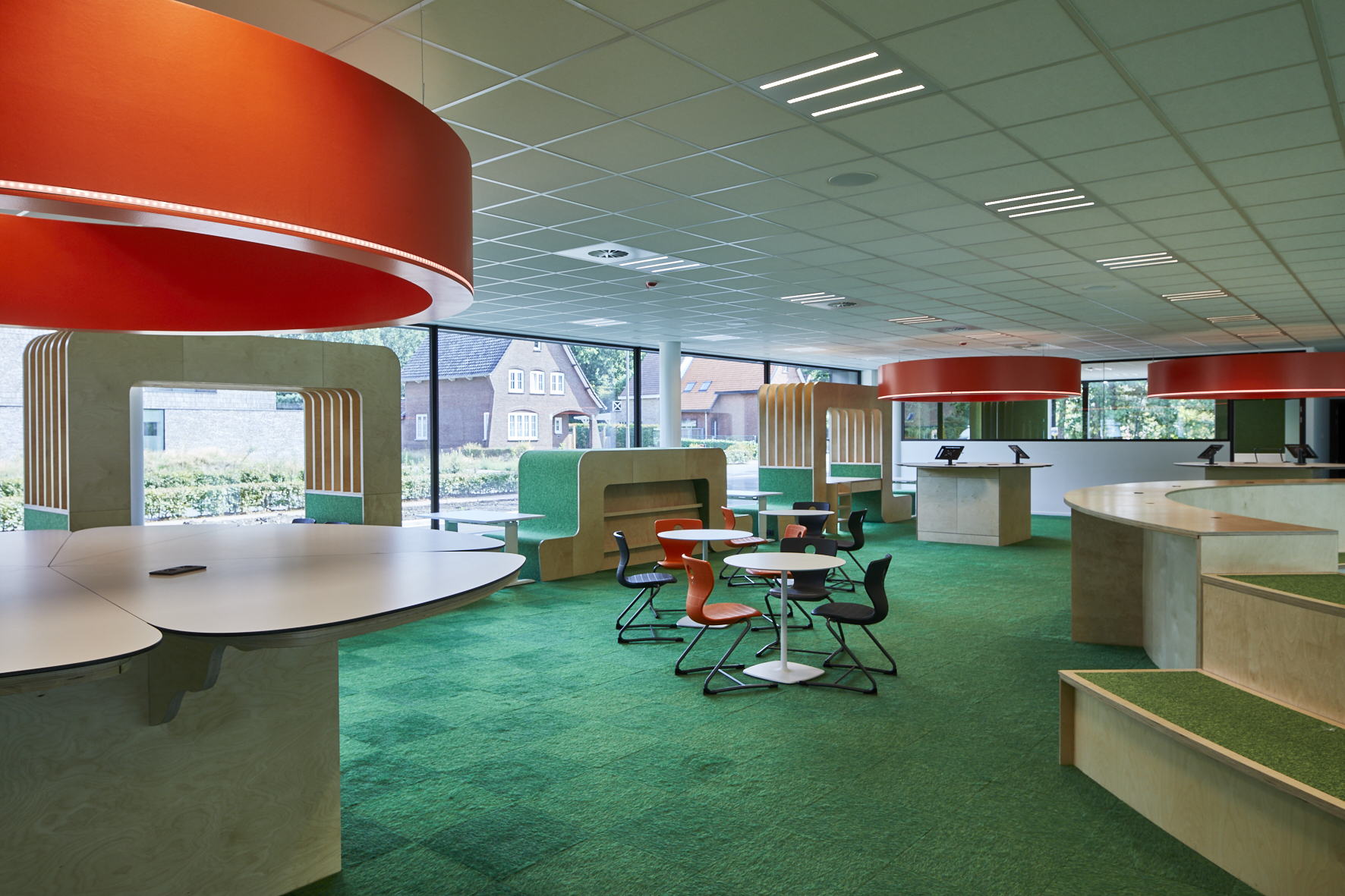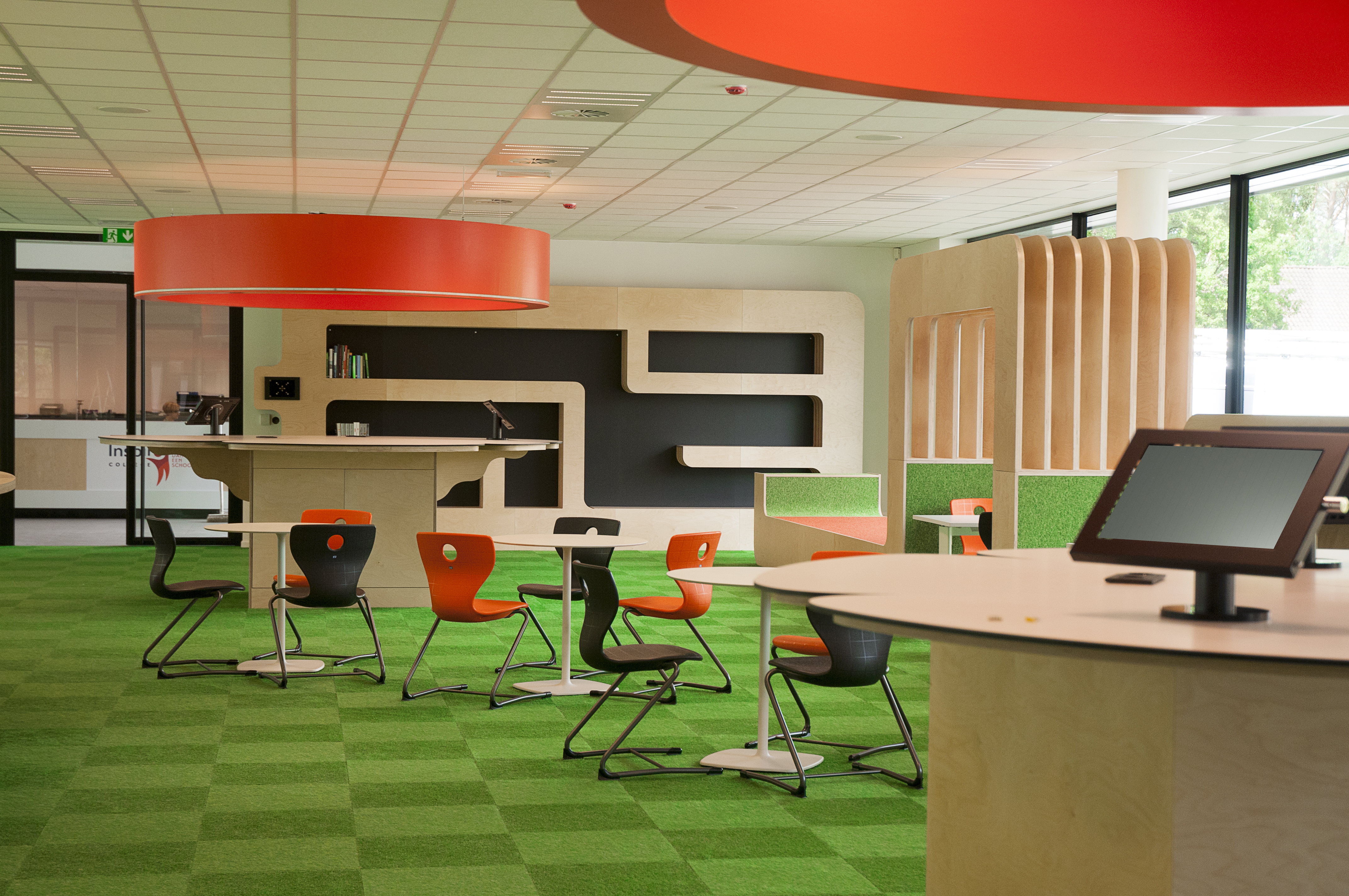 Wanneer het over schoolinrichting gaat, speelt akoestiek een erg belangrijke rol. En dat belang wordt in dit project, met veel open ruimtes, nog extra benadrukt. De grootste behoefte van alle actoren is op dit moment een plaats waar groepen kunnen samenwerken, discussiëren, of waar men gewoon even heel enthousiast en luid mag zijn. Maar evengoed moet de ruimte uitnodigen tot stilte en concentratie. En dat vraagt de nodige akoestische inspanningen. Ronde en zachte materialen bijdragen tot meer respect, verdraagzaamheid en mensen minder agressief maakt. \"We hebben dit dan ook met veel plezier geïmplementeerd in deze ruimte. Er bestaat veel sepsis over 'tapijt' in de ruimte, maar tapijt is even hygiënisch als een tegelvloer. Bijkomend herinner ik me als tiener hoe vaak dat klaslokalen een akoestische nachtmerrie waren. Zachte materialen zorgen voor absorptie en maken de ruimte aangenamer.\" Tijdens het event 'akoestiek & esthetiek' op de Intirio-vakbeurs zal Deusjevoo de relatie tussen beide begrippen in Inspirodroom uitgebreid toelichten.