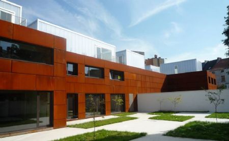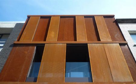 Om de geest van de oude fabriekssite te versterken wordt de buitenzijde bekleed met panelen in cortenstaal. De binnengevels van de patio’s, de binnenstraat alsook de toegevoegde volumes bovenop het dak worden afgewerkt met polycarbonaatplaten. Kortom, oud versus nieuw, massiviteit versus transparantie, ruw versus gepolijst, donker versus licht.