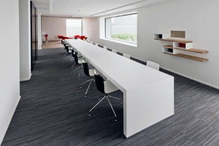 Bij het betreden van het kantoorgebouw, kom je in een atrium dat open is gewerkt tot aan de glazen dakkoepel vier verdiepingen hoger. Ondanks het gesloten karakter van het gebouw, is er dus toch voldoende natuurlijke lichtinval. Dit wordt nog versterkt door het witte interieur, met hier en daar een zwart accent in de vloer of op de muur. De parketvloeren op de verdiepingen, gecombineerd met vast tapijt, moeten zorgen voor een warme toets.