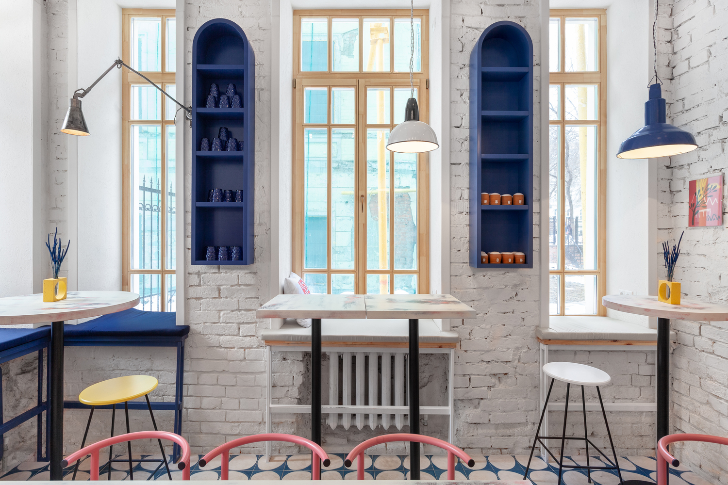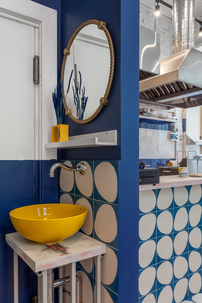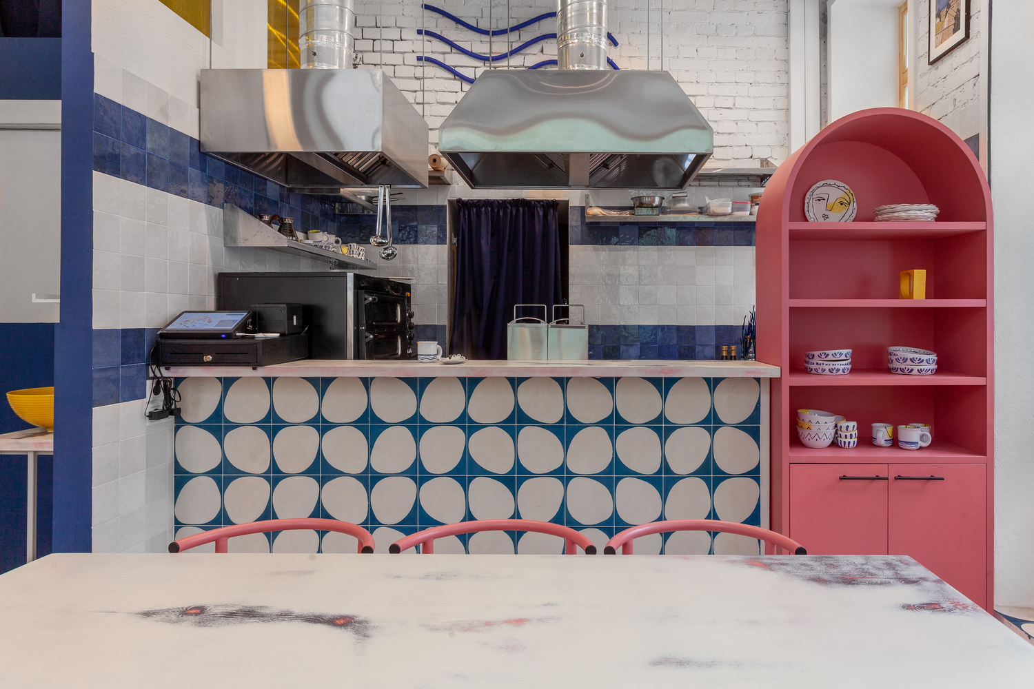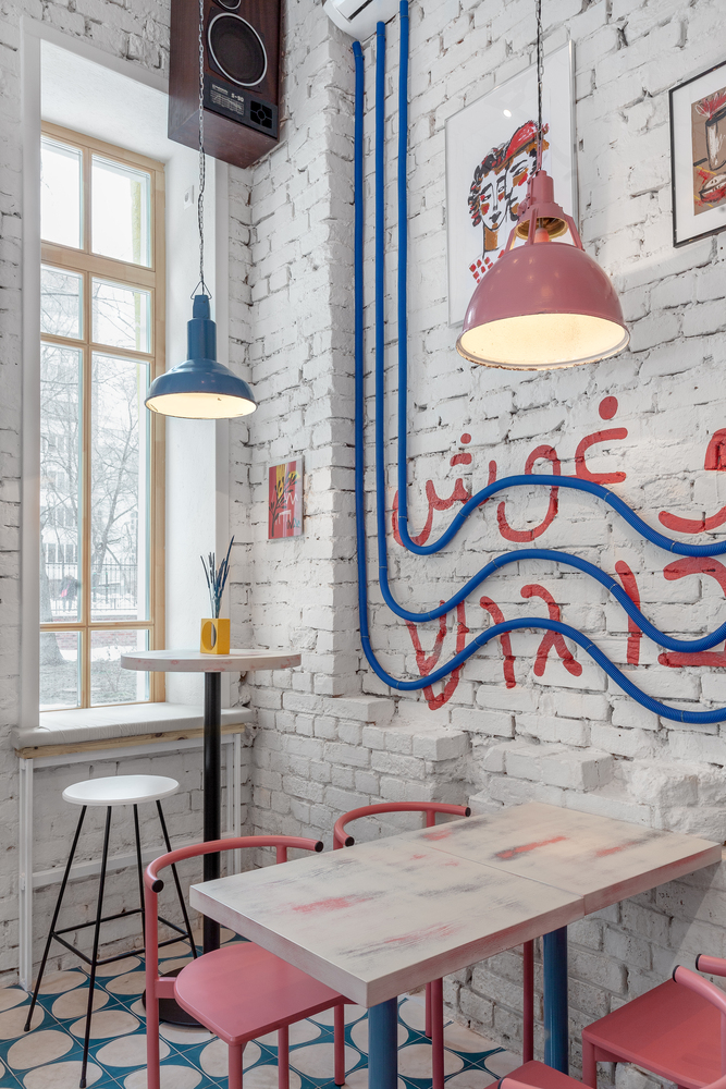 Het interieur van het Abu Gosh Restaurant, ontworpen door STUDIO SHOO, combineert speelsheid met het Israƫlische karakter. De felle gele, roze en blauwe kleuren voeren een dialoog met de gerestaureerde muren en ramen, vintage lampen en ander antiek.