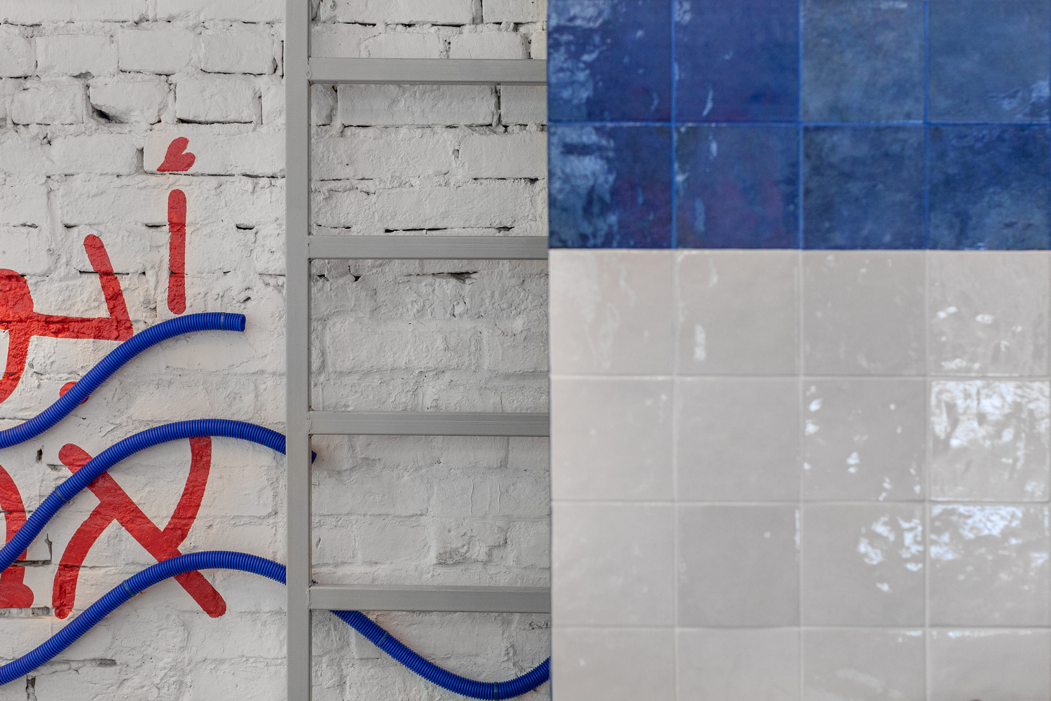 De hal is een hoge en lichte ruimte, waaraan felle accentkleuren zijn toegevoegd. De gedurfde blauwe, roze en gele tinten staan in contrast met de gerestaureerde muren van het paviljoen, een visnet en de handgemaakte tegels van cement. De oude ramen met een historisch patroon zorgen voor een maximale hoeveelheid zonlicht in de ruimte, die wordt gereflecteerd door de witte wanden. Twee decoratieve gele gebogen vensters van polycarbonaat zijn dan weer ontworpen om te worden geassocieerd met licht in het raam van het huis.