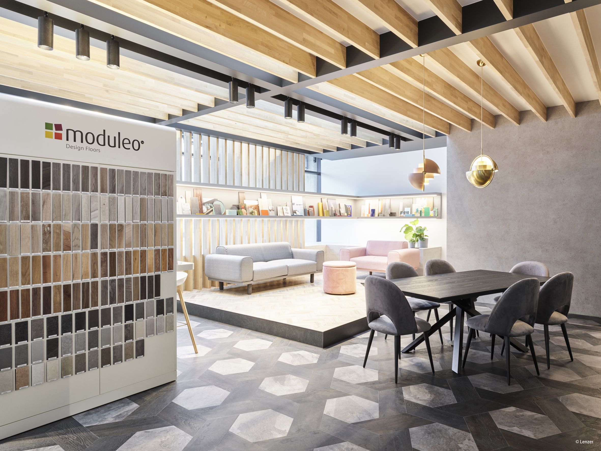 “Iedere zone heeft zijn eigen identiteit”, vult Cindy aan. “Zo ziet de Commercial Library eruit als een moderne bibliotheek met vloermaterialen bestemd voor een brede doelgroep van internationale designers, architecten en projectontwikkelaars. In het Moduleo House heerst een meer huiselijke sfeer en ligt de nadruk op design en comfort. Verder hebben we onze B2B-merken samengebracht in de Residential Market Place, waar kopers naar wens hun eigen assortiment kunnen samenstellen. Deze ruimte plaatst onze producten voor particulieren in de kijker en inspireert retailers om de vloeren in hun winkels op een gelijkaardige manier te presenteren.”
