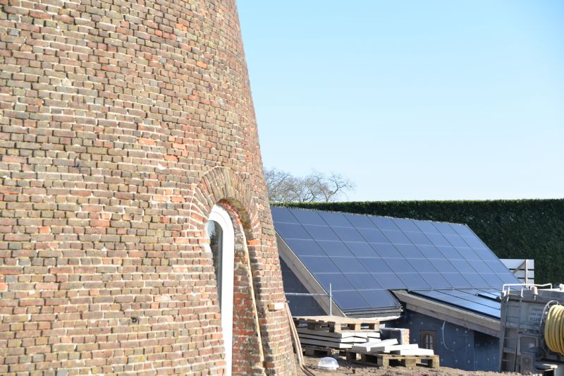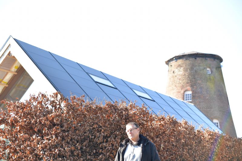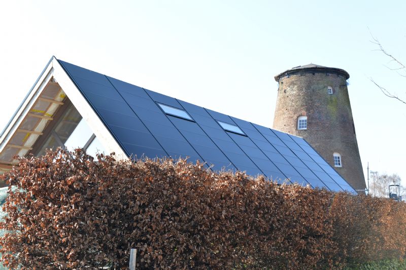 "Toen ik het huis renoveerde, wilde ik er eens alles insteken wat ik kende van hernieuwbare energie-oplossingen," zegt Gie Verbunt, bezieler van het Molenhuisje. Als CEO van IZEN, de marktleider wat betreft rooftop zonnepanelen in België, heeft Verbunt meer dan 30 jaar ervaring in de sector, en dus een hele resem ideeën. Het huis is uiteraard sterk geïsoleerd, en wordt verwarmd met zonnecollectoren. Ook het warme water komt daarvan, en in het ventilatiesysteem wordt de warmte gerecupereerd. Stroom krijgt de woning van de speciaal in het dak geïntegreerde zonnepanelen, maar die produceren dus veel meer dan nodig is.
