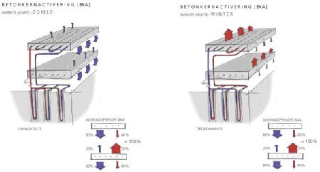 Bij betonkernactivering ‘activeert’ men de betonmassa van een gebouw door ze op strategische momenten warmte of koelte te laten opslaan en afgeven. Ze doet met haar grote dichtheid dienst als buffer tegen te hoge of te lage buitentemperaturen en zorgt ervoor dat de binnentemperatuur er op geen enkele manier door beïnvloed wordt. Je kan zelf makkelijk bepalen of het systeem je gebouw verwarmt of koelt, wat door de thermische inertiekwaliteiten van de betonmassa bovendien op een erg gespreide en dus aangename manier gebeurt. Tijdens het storten van het beton legt men tussen twee gietsels enkele leidingen waardoor men – eens het gebouw in gebruik genomen is – water laat stromen. Wanneer het water warmer is dan de ruimtetemperatuur wordt het gebouw verwarmd, wanneer het kouder is start de koeling. De thermische energie wordt op die manier opgeslagen in en afgegeven door de vloeren en de plafonds. Aangezien dit enkel met water van zeer gematigde temperaturen mogelijk is en de straling uitermate ‘gespreid’ plaatsvindt, kan de verwarming en de koeling erg goedkoop gebeuren.