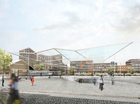 Turnhout (Bureau B+B, B-Architecten): een nieuw stadsplein aan weerszijden van de sporen, verenigd onder een grote luifelstructuur. (Visualisatie: B-Architecten & Bureau B+B)