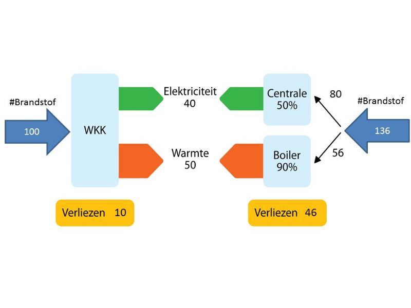 Een microwarmtekrachtinstallatie vervangt in eerste instantie een klassieke verwarmingsketel. De installatie is in staat om de nodige warmte te leveren maar bijkomend wekt ze ook elektriciteit op voor het huishouden. Dit zorgt ervoor dat de gebruikte brandstof efficiënter benut wordt dan in de situatie met een stookketel waarbij de elektriciteit in een centrale wordt opgewekt. Op deze manier wordt er een primaire-energiebesparing gerealiseerd zoals te zien is in het voorbeeld van figuur 1. Hoe groot de besparing precies is, hangt af van de gebruikte technologie binnenin de micro-WKK en het huishouden waar ze geplaatst wordt.