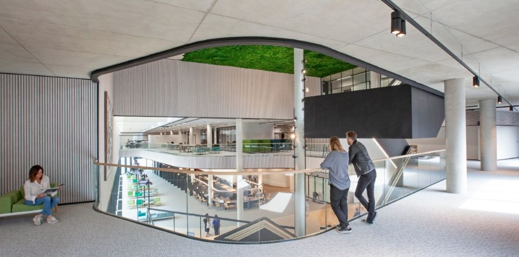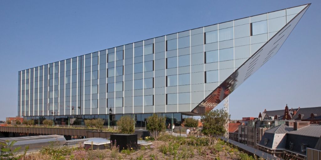Het nieuwe stadhuis van Hasselt is een landmark in de stad, zichtbaar van op de Hasseltse kleine ring. Maar het is ook veel meer dan dat. De nieuwbouw vormt niet alleen één geheel met het aangrenzende plein, maar ook met de naastgelegen oude rijkswachtkazerne, een gebouw uit 1879 in neoklassieke stijl dat voor dit project een grondige renovatie heeft ondergaan. Opmerkelijk aan het nieuwe gebouw is onder andere de schuine spiegelwand, die de beweging in de stad en op het onderliggende plein reflecteert.