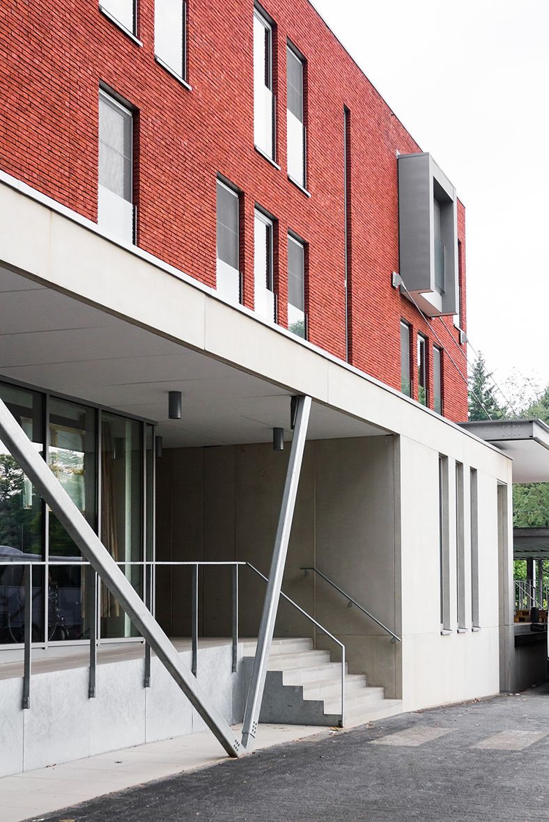 Gezien de grote omvang van het totale complex, werd er gezocht naar een transparante compactheid die de woon- en groenomgeving minimaal belast. De lay-out van de gebouwen op het terrein maakt van het bestaande hoofdgebouw een ideale ruggengraat voor het nieuwe geheel. Rechts van die as is er het rusthuisgedeelte met op de gelijkvloerse verdieping de afdeling voor de demente bejaarden. Door het sluiten van het bouwvolume achteraan wordt een veilige en geborgen binnentuin gecreëerd voor deze bewoners.
