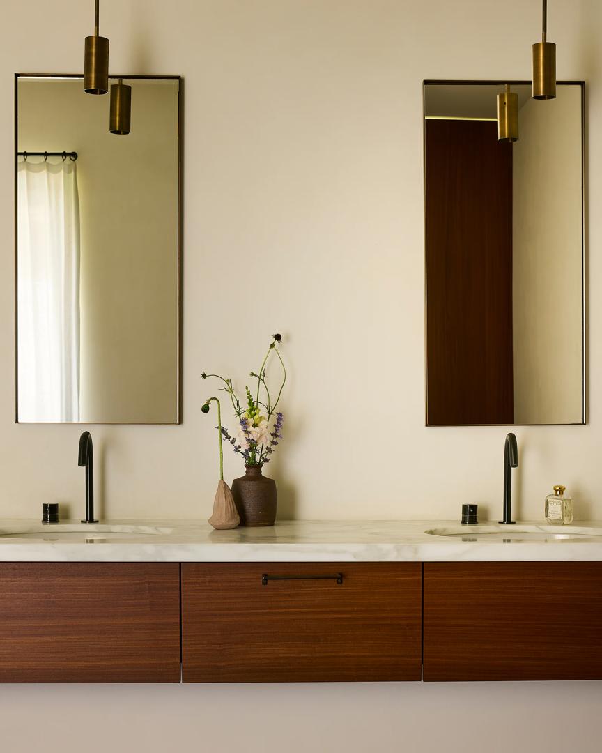 Ook in de badkamer vormt materiaal het vertrekpunt van het ontwerp. Een expressieve rode natuursteen van Dominique Desimpel zet de toon, aangevuld met Calacatta-marmer voor de wastafels en zachtroze tegels in de douche. Deze gedurfde combinaties tonen een uitgesproken gevoel voor kleur en textuur, zonder in effectbejag te vervallen. Het resultaat is een interieur dat tegelijk persoonlijk en tijdloos aanvoelt.