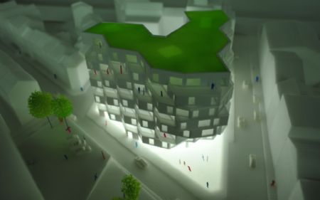 Een grote publieke ruimte in combinatie met een monumentale toegang tot het gebouw voorziet het architectenbureau door vier verdiepingen van de hoektoren te snijden. De drie torens krijgen in dit ontwerp bovenaan verder ook een afsnijding langs de bovenste twee verdiepingen, waardoor grote open terrassen ontstaan die gericht zijn op het zuiden en mooie stadsgezichten opleveren. De andere appartementen hebben balkons die aan de gevel hangen en zijn zo geplaatst dat ze de privacy van de andere bewoners garanderen, wat het geheel bovendien een speels karakter geeft.