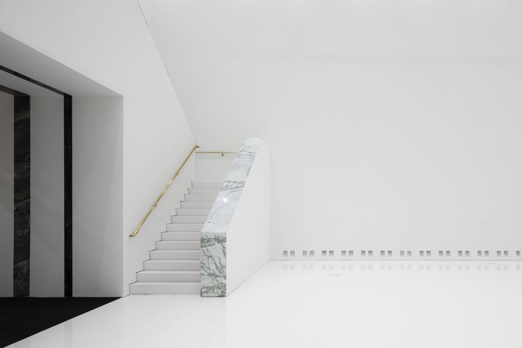 Het H-vormig volume is gesitueerd in de vier bestaande patio’s als een autonome entiteit. De ruimtes zijn sterk verticaal georiënteerd, net als de lange, rechtdoorgaande trap. Die loopt van de eerste tot de bovenste verdieping. De uitgesproken materiële identiteit van de uitbreiding staat bovendien in sterk contrast met het historisch karakter van het originele museum. Enkel waar het nieuwe volume het oorspronkelijke gebouw doorsnijdt, zijn marmeren vlakken toegevoegd. Die subtiele materialisatie weerspiegelt die van het negentiende-eeuws museum. Ook het kleurenpalet is een heldere variatie op dat van het neoclassicistische gebouw, want de zalen zijn bijna allemaal wit. Enkel de blauwe kabinetten zijn, zoals de benaming zelf zegt, blauw. Daar zal de meest kwetsbare kunst tentoongesteld worden.