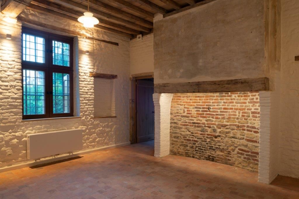 Het beschermde karakter van de pastorieën was tijdens de werken een constante factor. Nieuwe elementen mochten worden toegevoegd, maar moesten wel volledig losstaan van de oude structuur. “Zo bouwden we bijvoorbeeld een nieuw volume met sanitaire voorzieningen en een technische ruimte”, vertelt Emmerechts. “Zowel de kleine als de grote pastorie waren volledig verkrot. Ramen en deuren ontbraken, en de duiven vlogen af en aan, met een tien centimeter dikke laag uitwerpselen als gevolg. De kleine pastorie was er zelfs zo erg aan toe dat een groot aantal van de stenen aan de buitenkant moesten worden vervangen.”