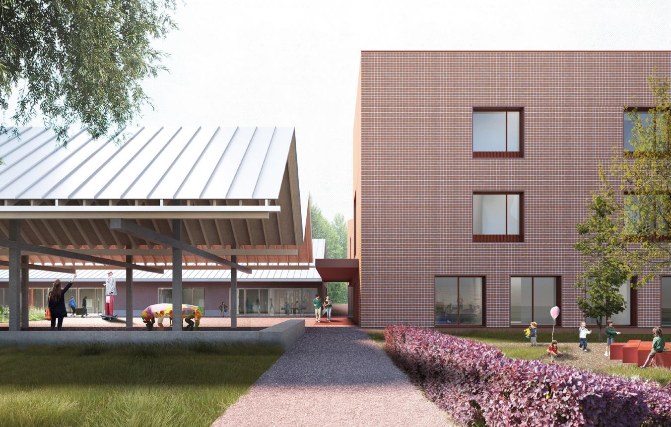Het programma voor het nieuw gebouw werd opgesplitst in drie geschakelde kleine volumes die goed aansluiten bij de korrel van de omgeving. De drie compacte gebouwen nestelen zich om een centrale speelplaats die het 'buitenhart' vormt van de school. Hun schakeling zorgt ervoor dat er aan de buitenzijde van de gebouwen diverse buitenruimtes ontstaan die aangepast ingericht worden in functie van de doelgroep of gewenste activiteit. Daarnaast wordt ook het gedeeld gebruik van de ruimtes makkelijker beheersbaar doordat de gebouwen apart afsluitbaar zijn.