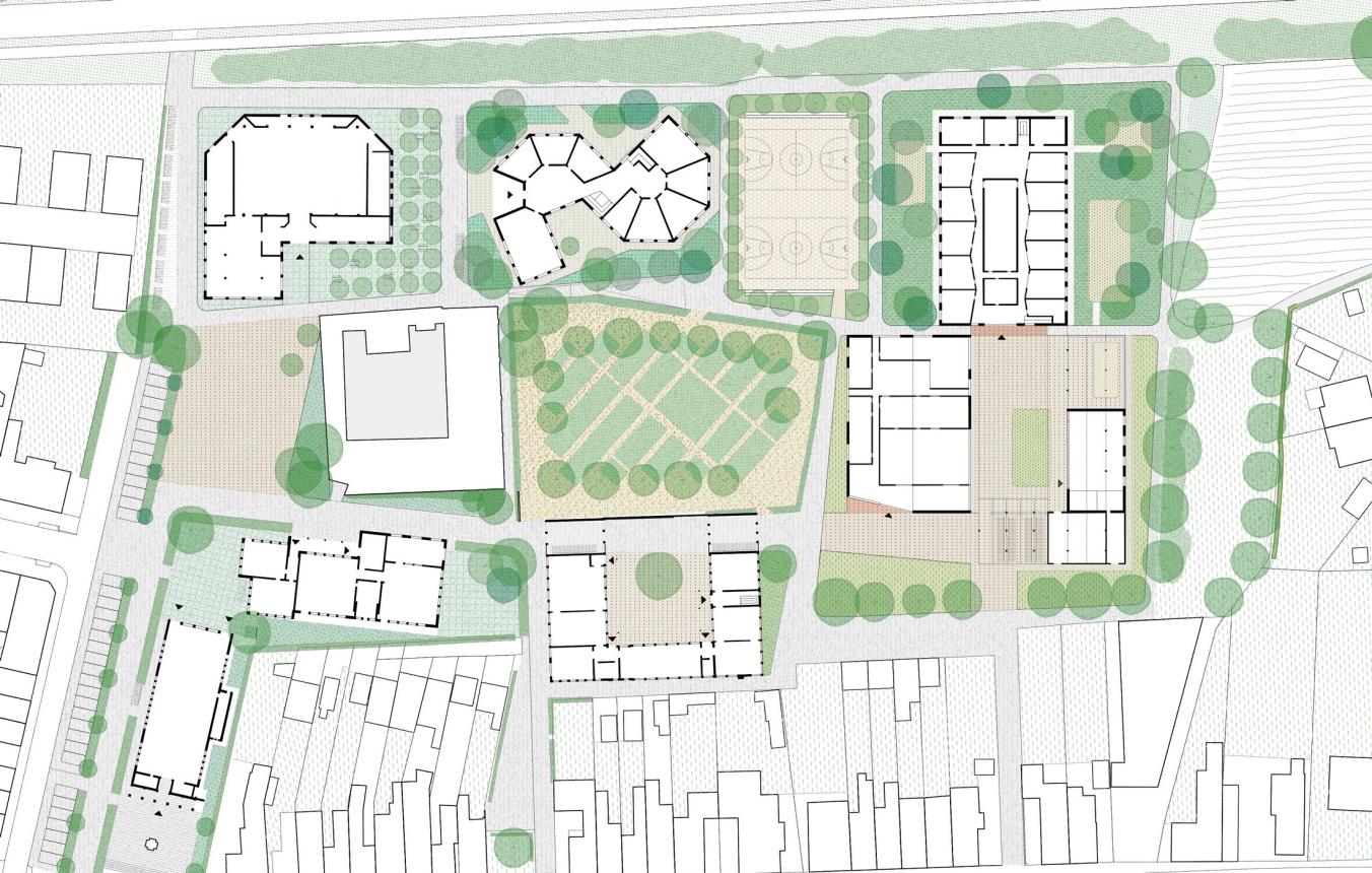 Het voorgestelde masterplan voor de campus creëert een structuur van landschapskamers op basis van de historische landbouwpercelen. Deze kamers krijgen elk hun eigen karakter en invulling, hetzij als open ruimte, hetzij als gebouw. De kamerstructuur zorgt voor een schakeling van diverse, aantrekkelijke en uitnodigende (open) ruimtes die verbonden worden door zorgvuldig gekozen zichtassen. Op deze manier slagen de ontwerpers erin om de bestaande en de nieuwe delen van de campus samen te voegen in een leesbaar geheel.