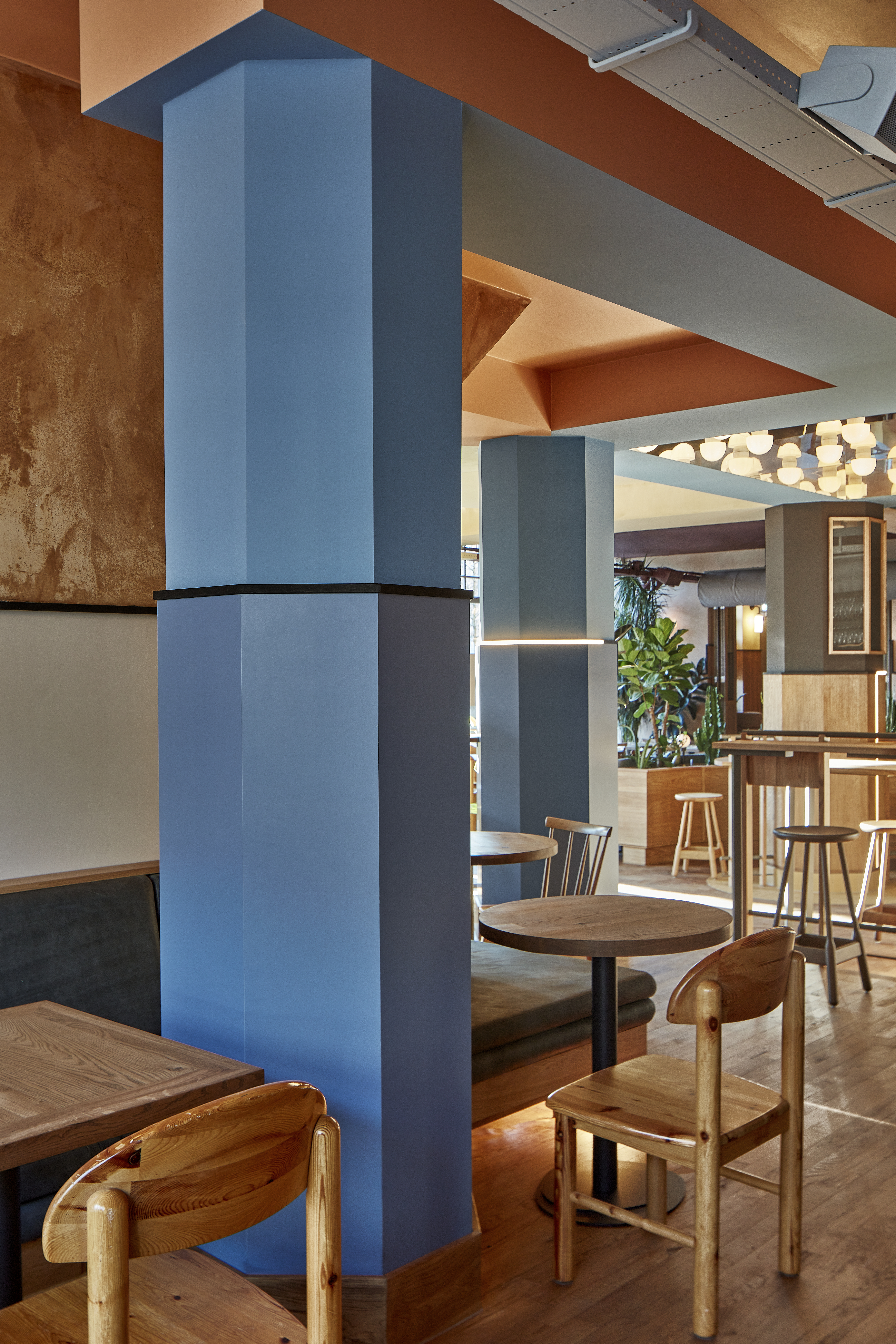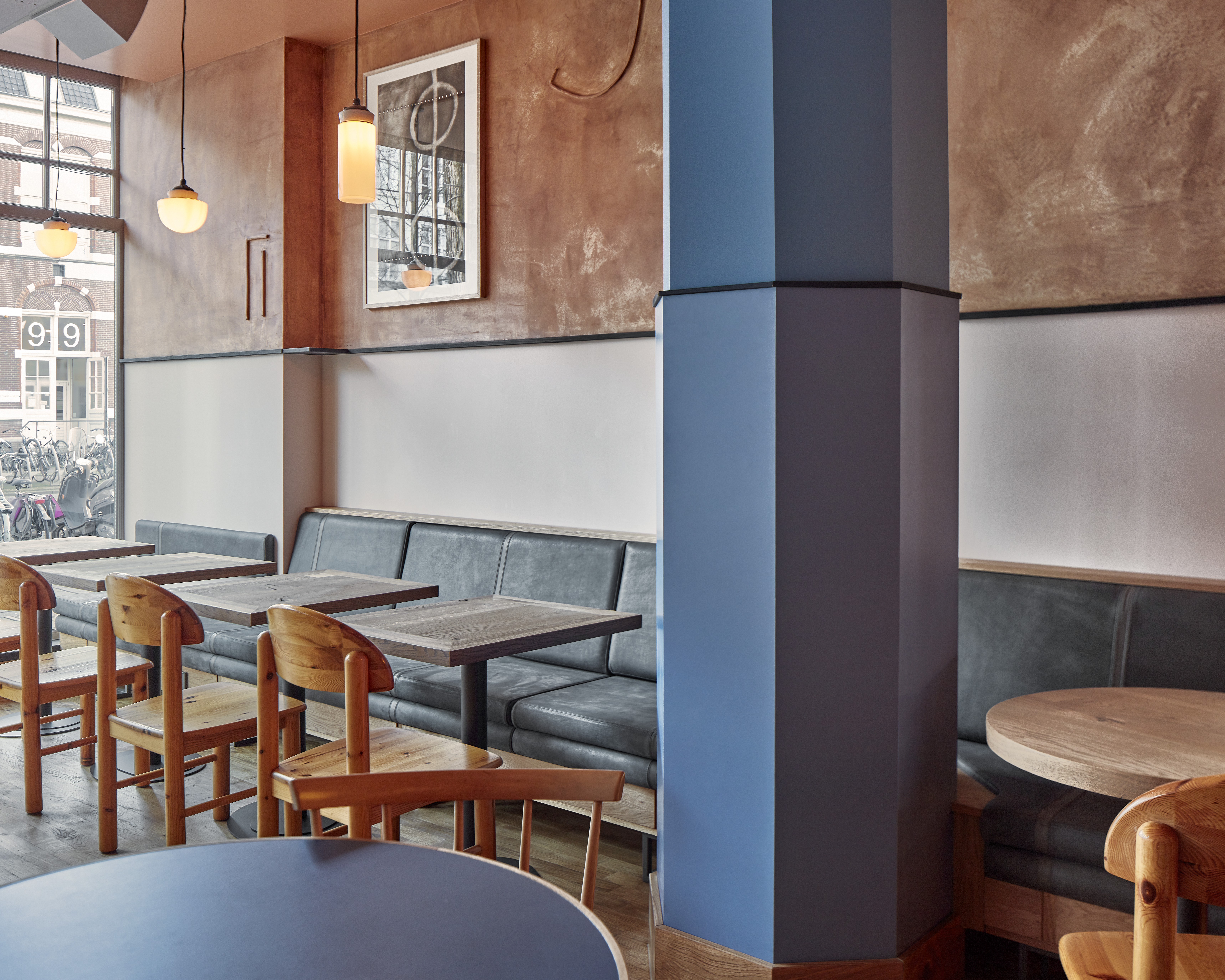 Terwijl de bar zich om de hoek wikkelt, verandert hij van niveau waar een speelse zitplaats op maat van de klanten leidt naar een van de eetgelegenheden. Hier zijn de kleuren dramatischer waardoor er een mysterieuze sfeer ontstaat: het glanzende plafond, de diepblauwe zuil en de stucwerkmuren herinneren aan de reflecties van het water en de ruwheid van de delta's van een moeras. Een gelijkaardige sfeer verschijnt opnieuw aan de andere kant van de zaal, met een uitzicht op het plein, waar een donkerpaars plafond en een op maat gemaakte gebogen bankje een hoek creëren met de aangrenzende zuil Hierdoor wordt de bar gescheiden van de eetruimte.