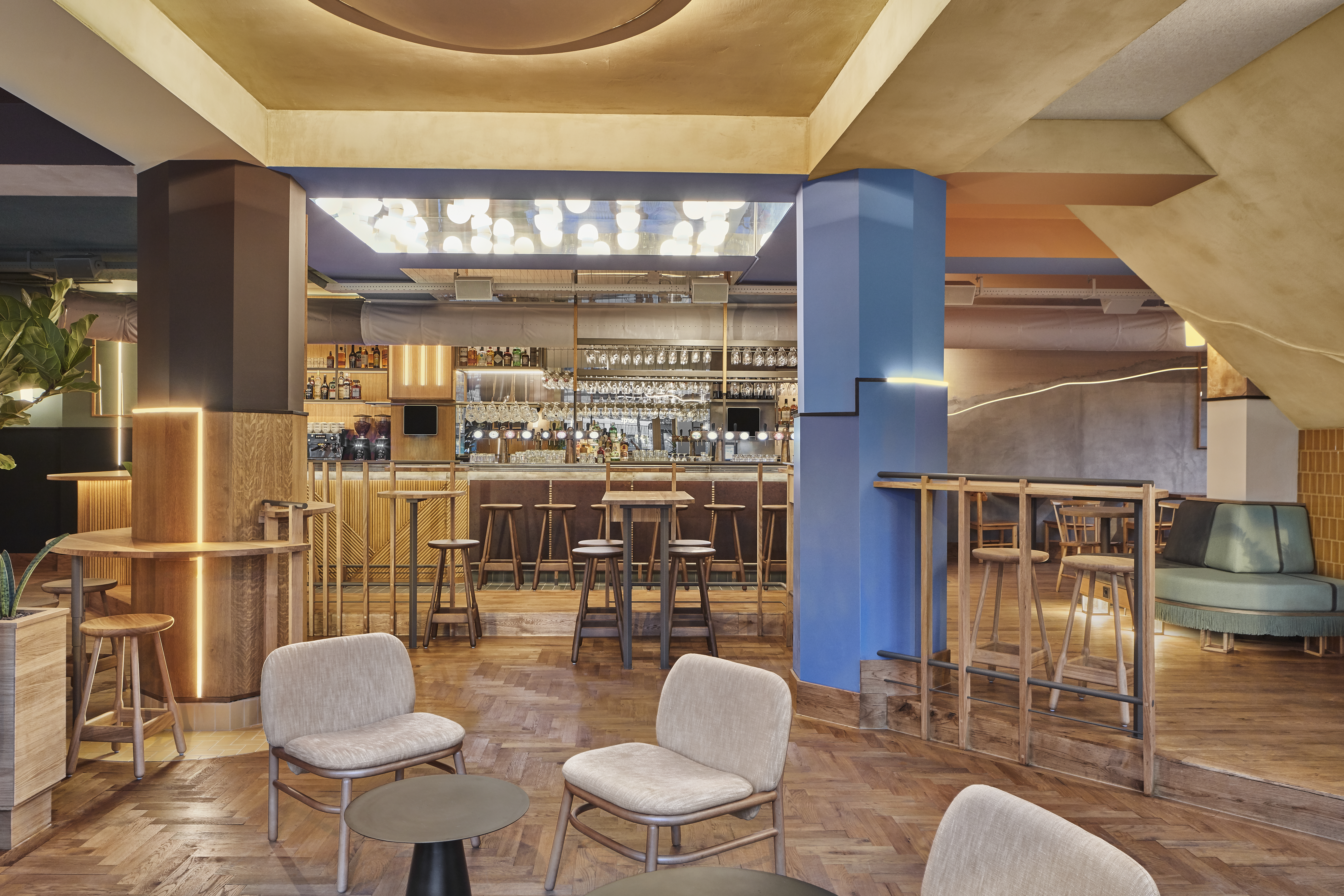 Lichtstralen aan de ene kant en lichtbogen aan de andere kant, omarmen een kleine houten bar en speelse hoge zitplaatsen, waardoor er een intieme hoek ontstaat. Op een paar stappen van de kleine bar domineren warme kleuren en zachtere lijnen. De tegelvloer is bedekt met een zacht vloerkleed en de houten lamellen van de muur zijn bedekt door een fluwelen goudkleurig gordijn. Een ideale plek om te ontspannen op de rode fluwelen loungezetels.
