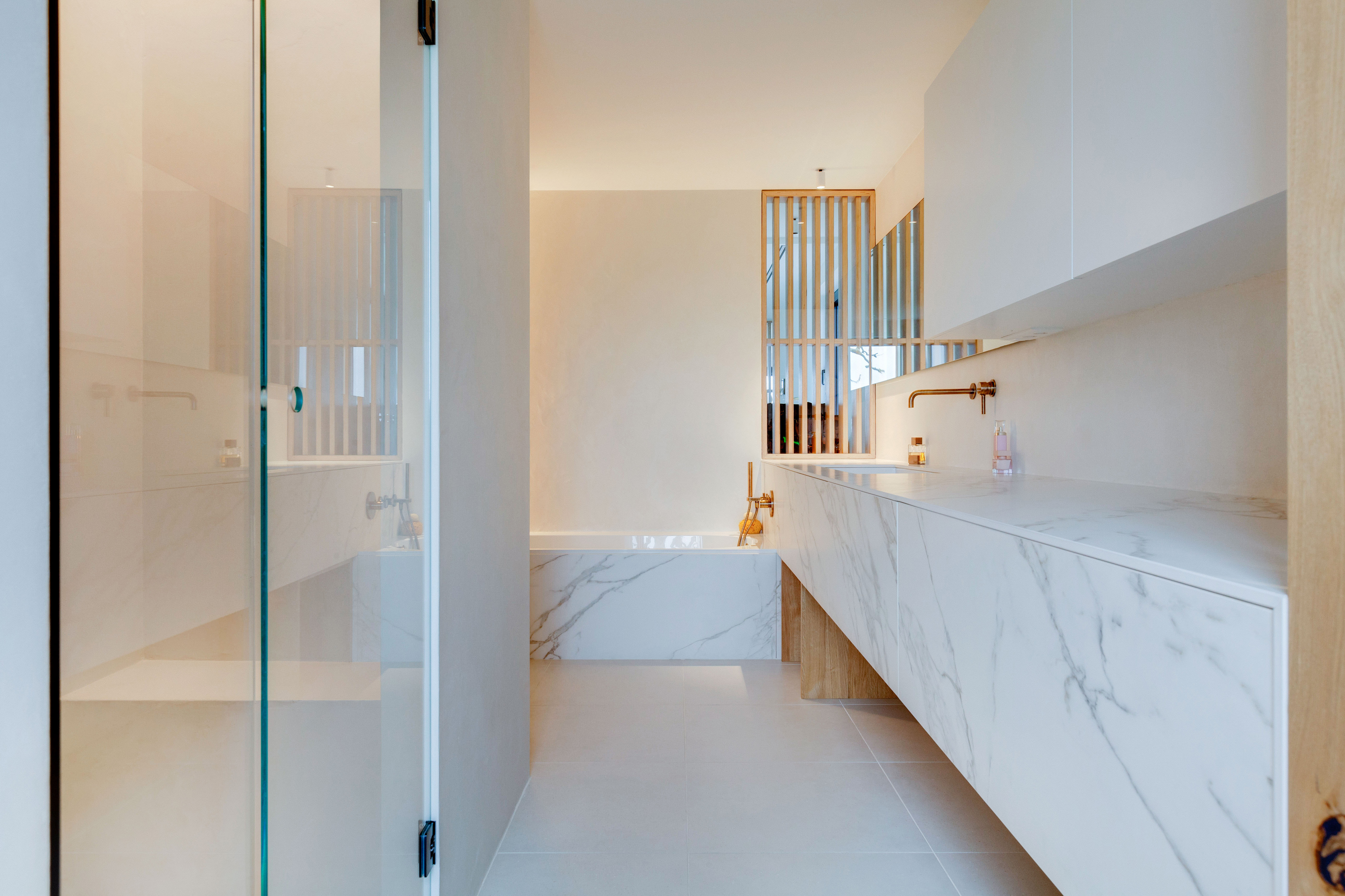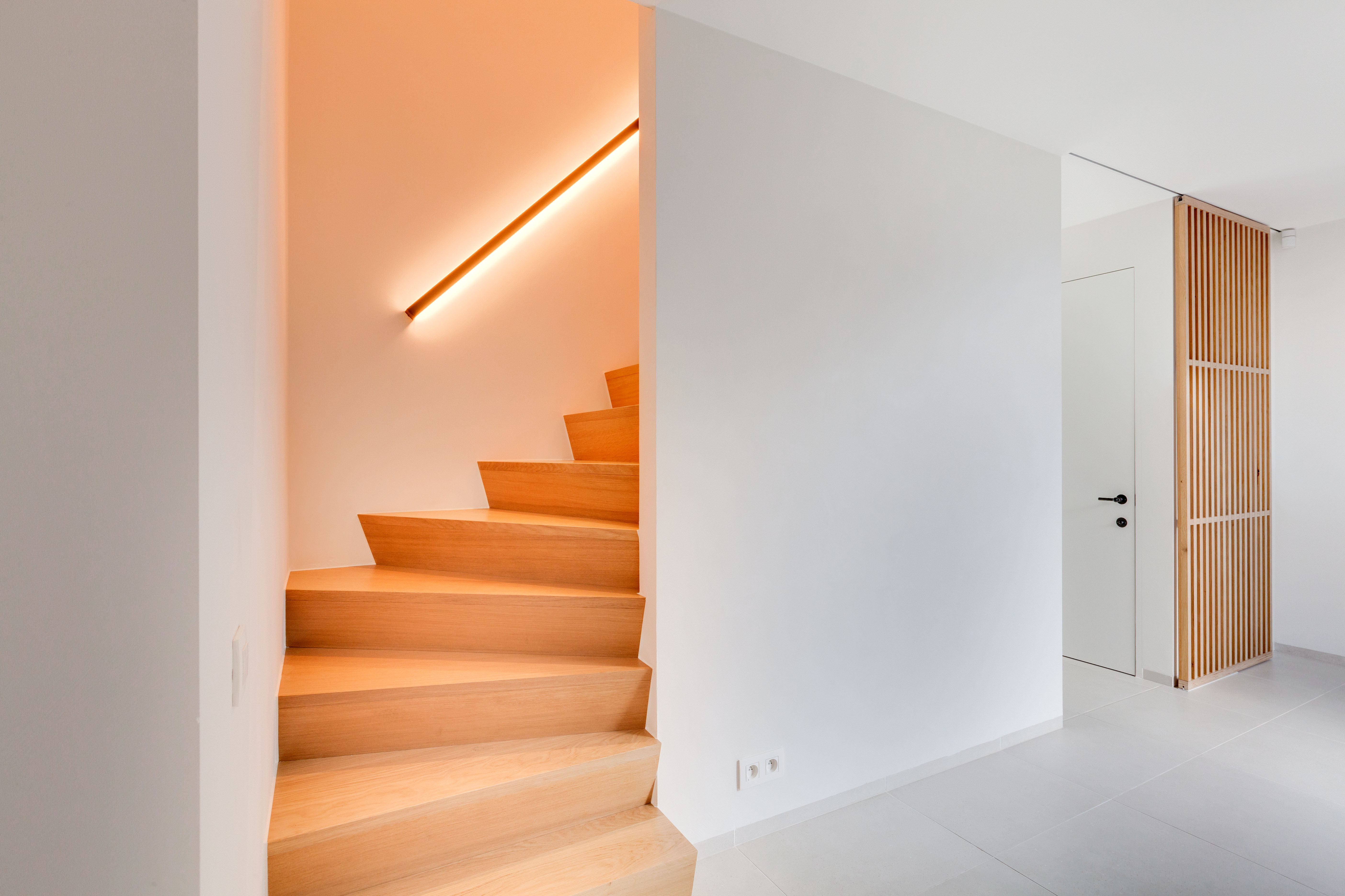 De zachte kleuren van het interieur zorgen voor warmte en gezelligheid. Door de hele woning heen is er consequent gebruik gemaakt van kwalitatieve materialen als marmer, rustieke eik en witte mortex. Vervolgens werd de doorkijk doorheen de verschillende ruimtes behouden, mede door een open lattenframe. Verder verstrekt het binnentrekken van de buitentegel binnen in de woning het binnen- en buitengevoel. Een eerste uitdaging was het brengen van openheid en maximale lichtinval in een vrij donkere woning met veel compartimentering. De interieurarchitecten van acht acht moesten openheid en eenheid creëren tussen de bestaande ruimtes, met oog voor belijning. Ze moesten voornamelijk rekening houden met het gegeven dat het een renovatieproject betreft waarbij er geen structurele zware ingrepen mogen gebeuren. Verder moesten ze ook rekening houden met het tempo en de persoonlijkheid van de bouwheer om een woning op maat van de bewoners te kunnen voorzien. Ten slotte moest het materiaal geselecteerd worden met oog op het creëren van rust.