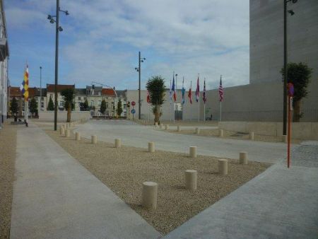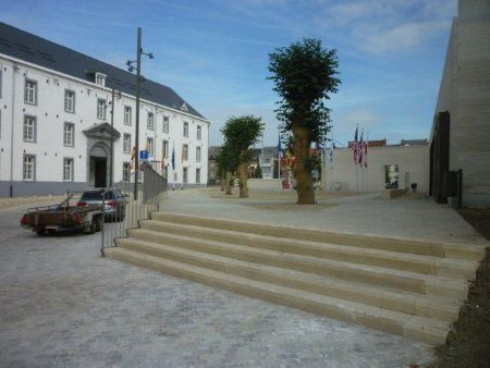 Het was aannemer Hertsens uit Burcht die de buiteninrichting op zich nam. Dit omvatte onder meer grond- en rioleringswerken, verhardingswerken, groenaanleg en het plaatsen van straatmeubilair en diverse andere constructies. Het specifieke materiaalgebruik en de vereiste, gedetailleerde afwerking van het plein plaatste Hertsens voor een bijzondere uitdaging: “We hadden in feite nog nooit met zulke materialen gewerkt, en dus was het geen evidentie om dit mooie resultaat te bekomen,” aldus Helena Hertsens. “We voeren dikwijls gelijkaardige projecten uit, maar zelden lag de graad van detaillering zo hoog als in dit project. De afwerking moest tip-top in orde zijn, want het esthetische aspect was uiteraard zeer belangrijk. De typische witgele kleur was door de architect – bOb Van Reeth van awg – op een uitstap naar Frankrijk opgemerkt, en het was net die kleur die in zijn ogen het meest geschikt was om de serene sfeer rond de Dossinkazerne op te roepen. De uiteindelijke samenhang tussen de verschillende infrastructuurelementen en het museumcomplex bewijst dat we in ons opzet geslaagd zijn.”