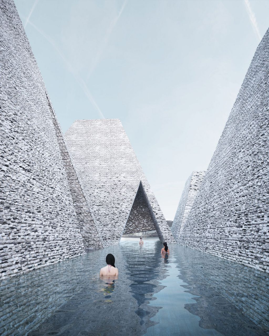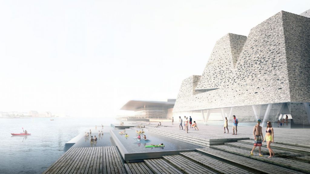 Het Japanse bureau Kengo Kuma & Associates werkt aan een ontwerp voor een watersportcentrum aan de haven van Kopenhagen. Het centrum biedt ruimte voor verschillende sportfaciliteiten, binnenzwembaden omringd door bakstenen piramides en buitenzwembaden die trapsgewijs reiken tot aan de zee.