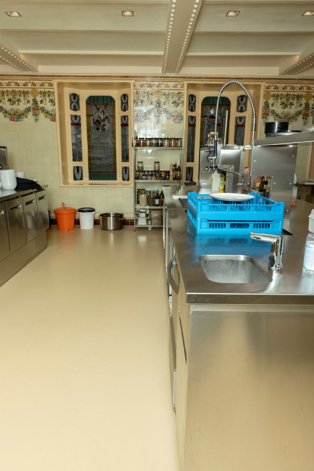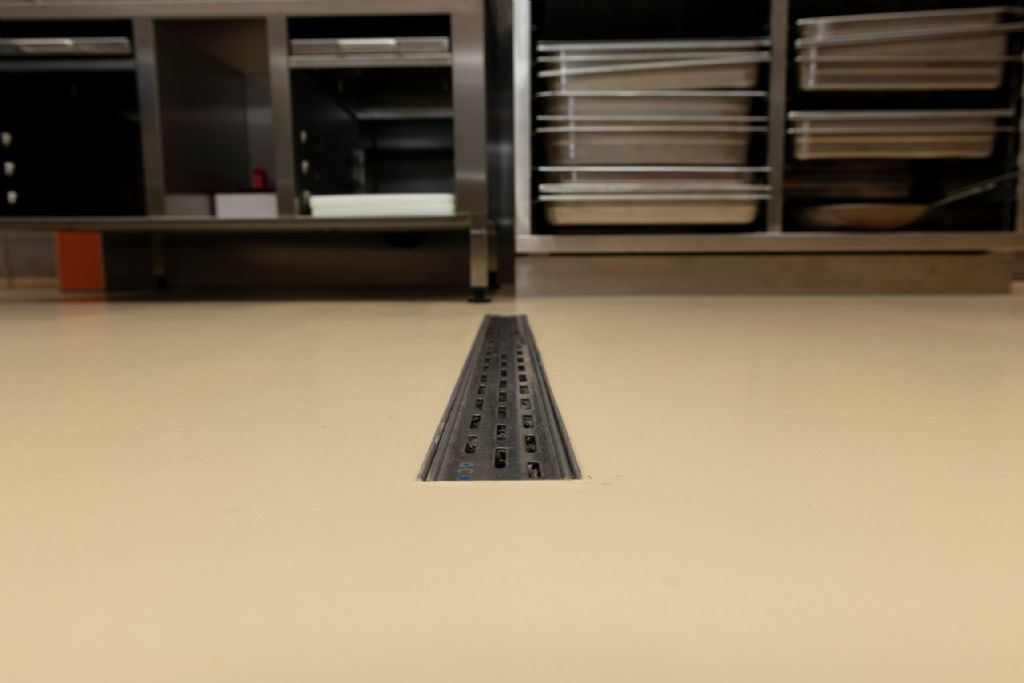 Vervolgens werd deze laag ook opgeschuurd en werd Arturo EP6500 vermengd met zand om te dienen als schraaplaag. De schraaplaag zorgt voor een vloeistofdichte vloer en verzekert de hechting tussen de gietvloer en de ondergrond. Op de schraaplaag werd de gietvloer Arturo EP2500 in RAL-kleur 1001 zo’n 2 mm dik geplaatst. Arturo EP2500 wordt gebruikt bij zwaar te belasten vloeren zoals in productieruimtes, magazijnen, werkplaatsen, … en in dit geval ook een restaurantkeuken. Als afwerking werd er gekozen voor Arturo EP7610, een waterverdunbare, transparante toplak met extra mat uiterlijk. In de eerste laag werd 7,5% Ballotini aangebracht om een voldoende lipvrije vloer te verkrijgen. Hierna kon de volledige keuken worden geïnstalleerd.