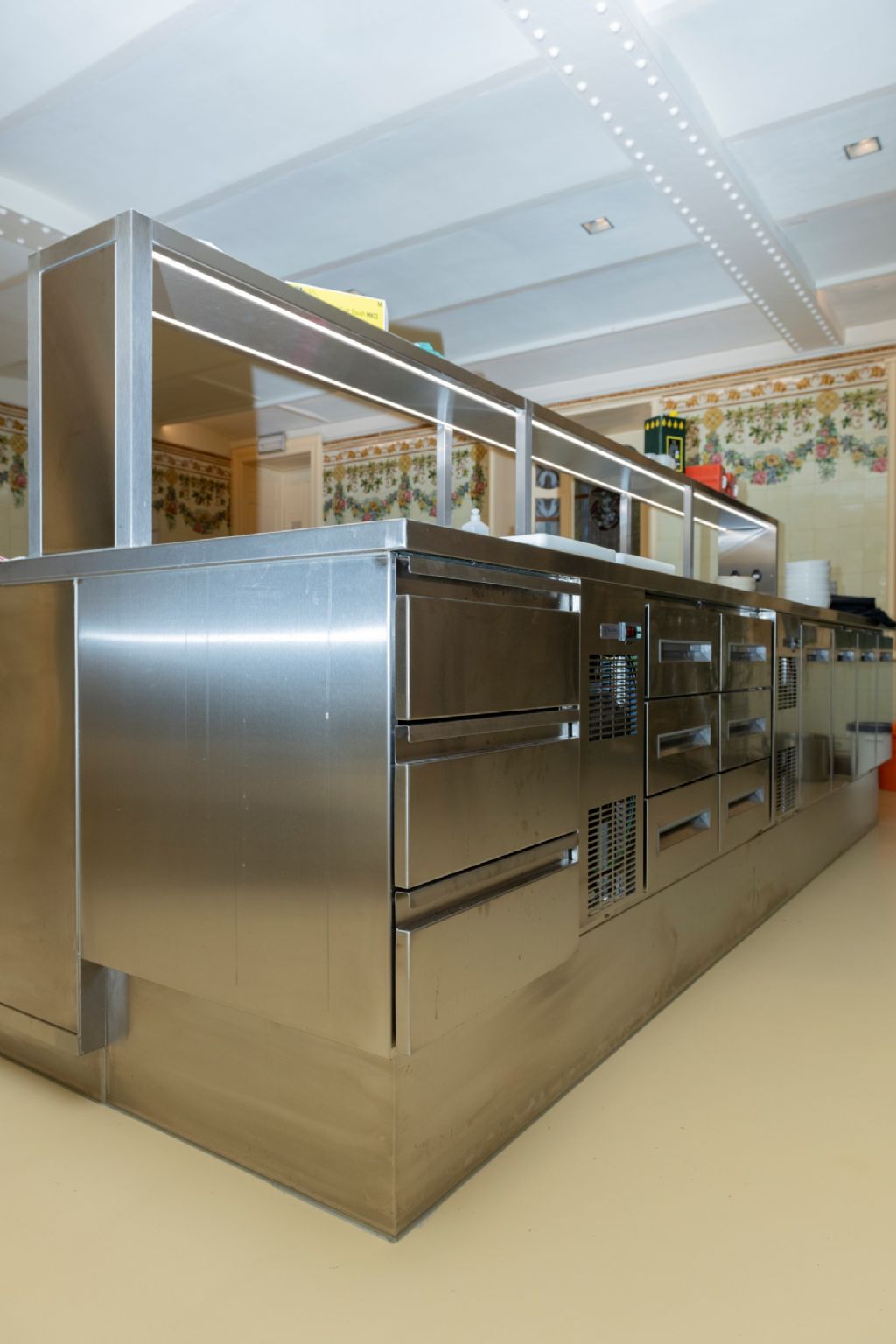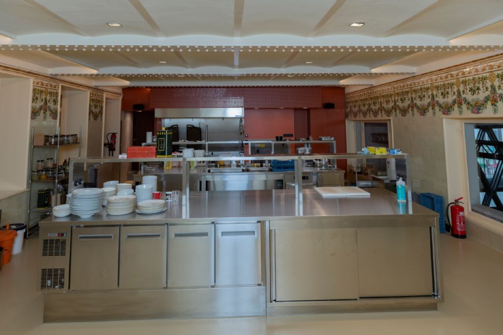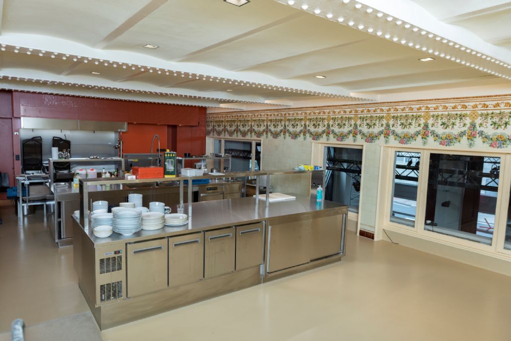 Kunstencentrum Vooruit werd in 1913 geopend. In deze “kunstentempel” konden arbeiders tegen erg democratische prijzen eten, drinken en genieten van cultuur. Sinds 1982 gebruikt Kunstencentrum Vooruit VZW de vijf belangrijkste zalen; Balzaal, Theaterzaal, Domzaal, Concertzaal en het Café. En net van dat café-restaurant was de keuken aan een grondige renovatie toe. De bestaande keuken was verouderd en voldeed niet meer aan de huidige regelgeving. Het Kunstencentrum besloot ook om de keuken ergens anders in het gebouw onder te brengen, een lokaal op de eerste verdieping leek de beste keuze. Deze ruimte had nog de originele oude wandtegels van toen de Vooruit werd opgericht.