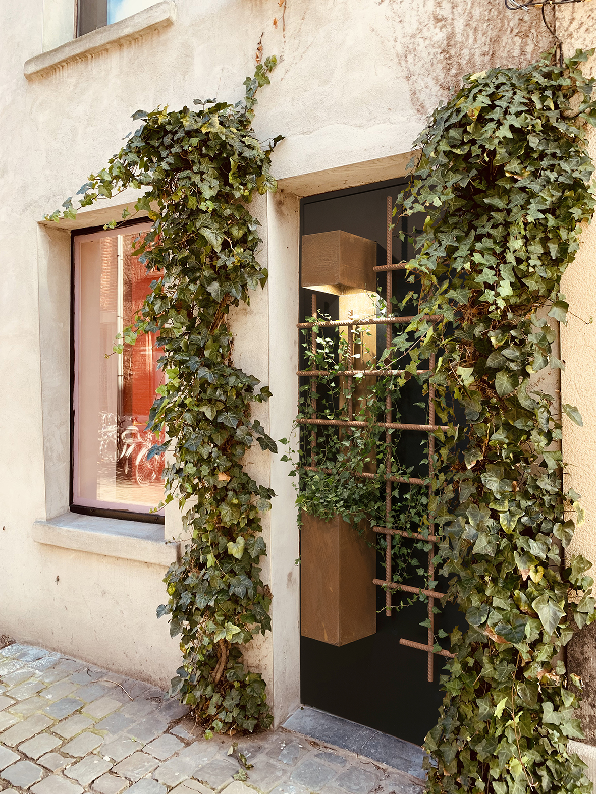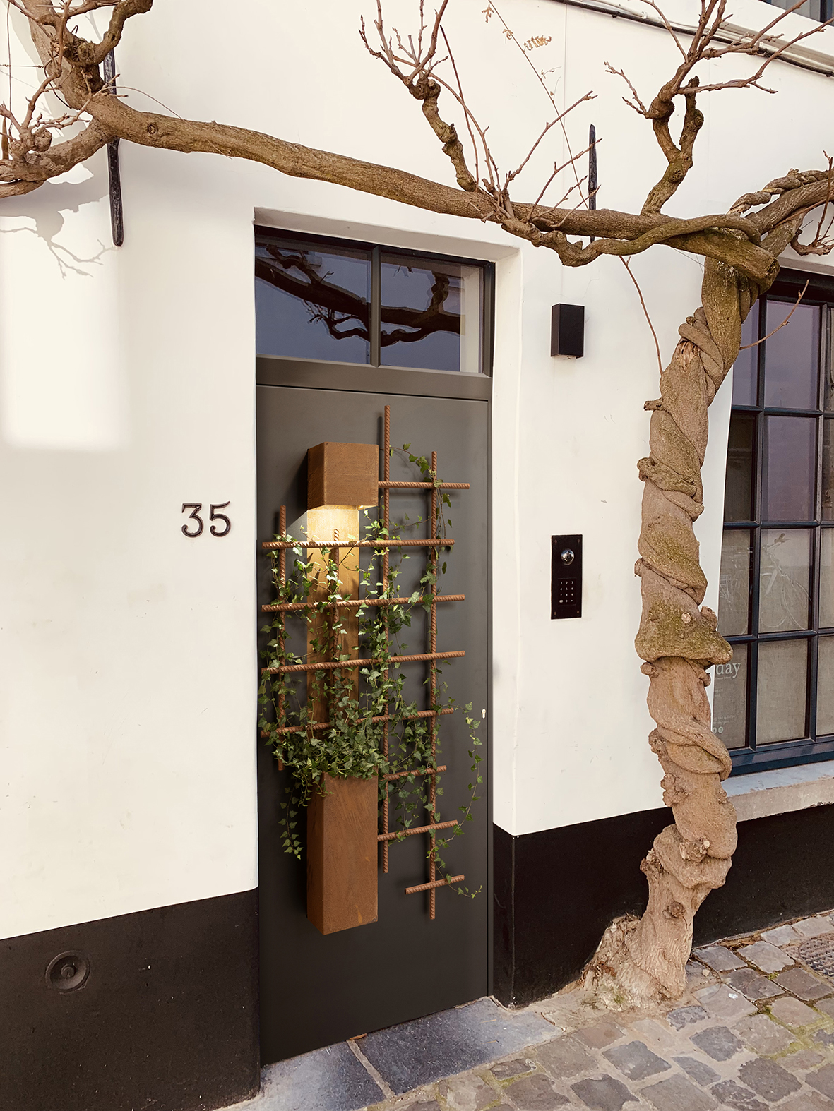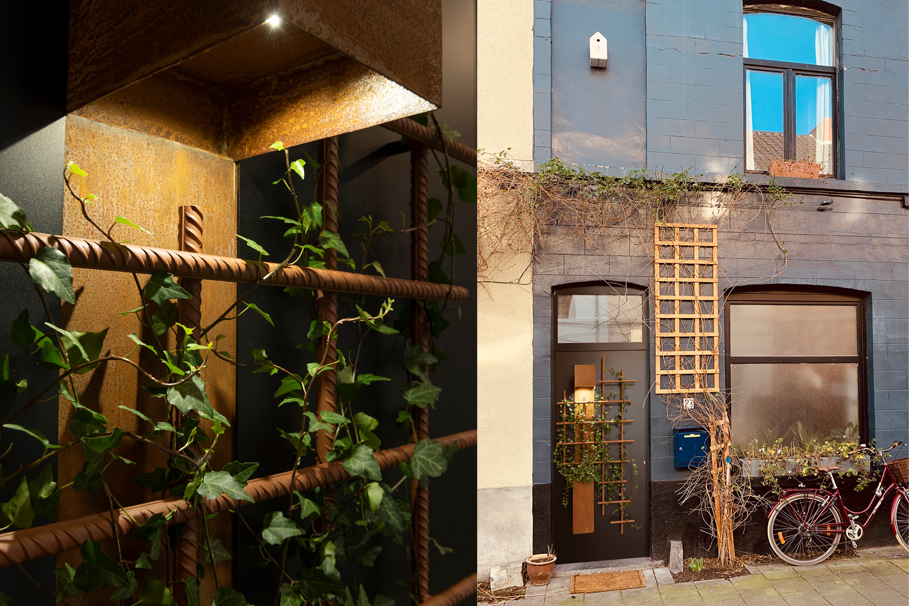 “Daarom heeft onze R&D-afdeling een deur ontwikkeld in cortenstaal, dat op een natuurlijke manier roest. Ze is echter ook begroeid met klimop en andere klimplanten die zich langs de deurtrekker een weg banen. Zo dragen we bij aan het verkoelen van de stad en aan het filteren van fijnstof in de lucht.”